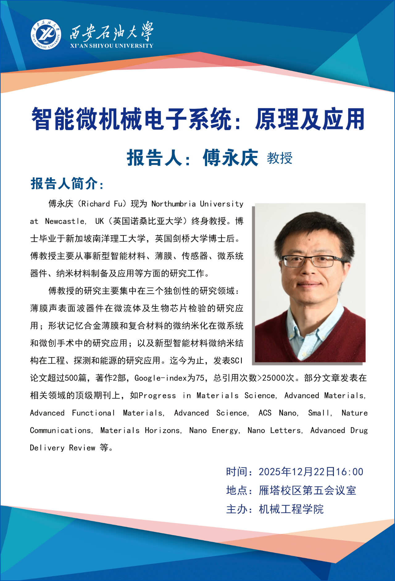报告地点:鄠邑校区博览楼A110智慧大讲堂