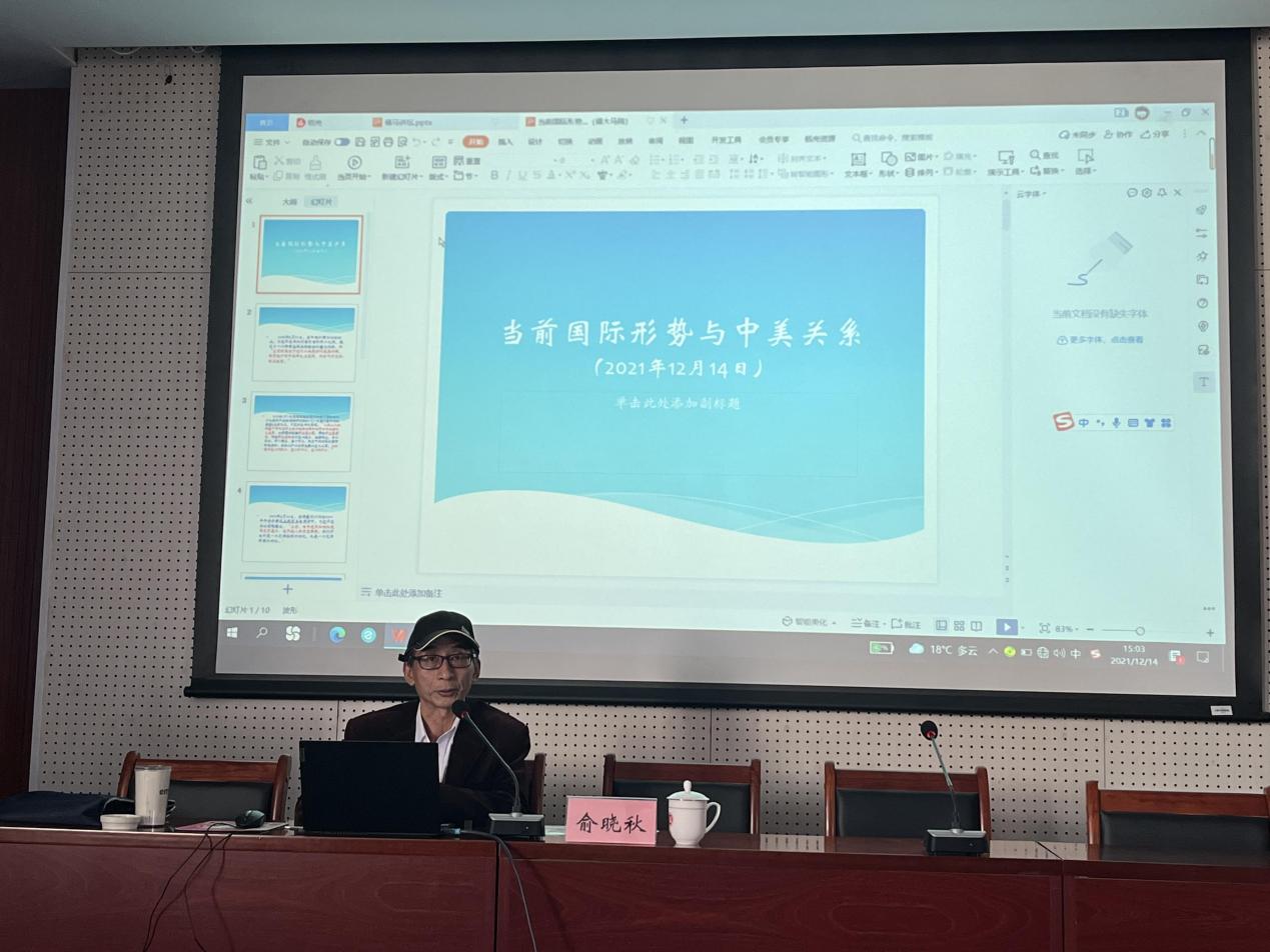 俞晓秋研究员以“世界正处于百年未有之大变局”中的“变”为切入点,剖析当前国内外局势的新变化,围绕新冠肺炎疫情、全球化进程、科学技术创新、国际力量对比、国家安全保障、网络话语权、全球环境问题以及我国国际地位八个方面展开讲授。同时,俞晓秋研究员表示,当前世界格局动荡的局面仍将持续,构建人类命运共同体是为加强全球治理贡献的中国方案和中国智慧。