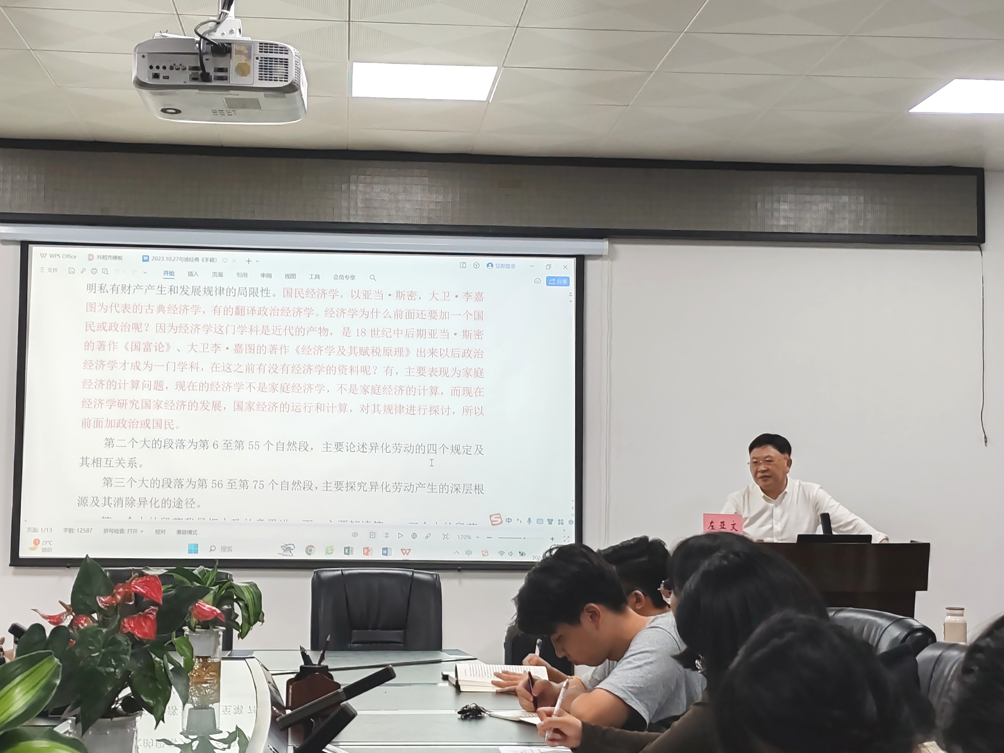为深化团员和青年主题教育,充分发挥“支部+社团”创新引领作用,2023年10月27日晚,“句读经典”(之二)理论经典著作读书会在德赢官网成功举办。本场读书会特邀德赢ac米兰官方合作vwin讲座教授(原武汉大学德赢ac米兰官方合作vwin教授)左亚文教授为我们深入解读《1844年经济学哲学手稿》(异化劳动和私有财产)一文,德赢ac米兰官方合作vwin教师代表、德赢ac米兰官方合作vwin研究生团支部团员、德赢ac米兰官方合作vwin学生马克思主义理论经典著作研习社成员共同参会。
