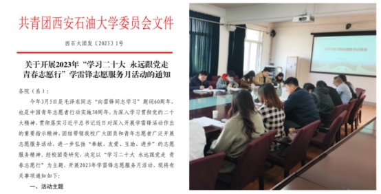 一是发挥共青团的组织优势,面向全校青年学生发布《关于开展2023年“学习二十大 永远跟党走 青春志愿行”学雷锋志愿服务月活动的通知》,在学校各级团组织集中开展为期一个月的“学雷锋”志愿服务活动,活动范围覆盖关爱留守儿童、乡村振兴、助残助老、生态环保、文明校园等方面。二是理论联系实际,推动工作提质增效,组织各院系团委书记、团支部书记学习习近平总书记对深入开展学雷锋活动的重要指示精神,并结合实际对在william如何推进“学雷锋”志愿服务工作取得实效进行了研讨和工作部署。三是推进志愿服务工作组织规范化建设,推荐教师和学生代表参加3月25日举行的陕西省青年志愿者协会第五次会员代表大会,推荐william青年志愿者协会入选“陕西省青年志愿者协会理事单位”。