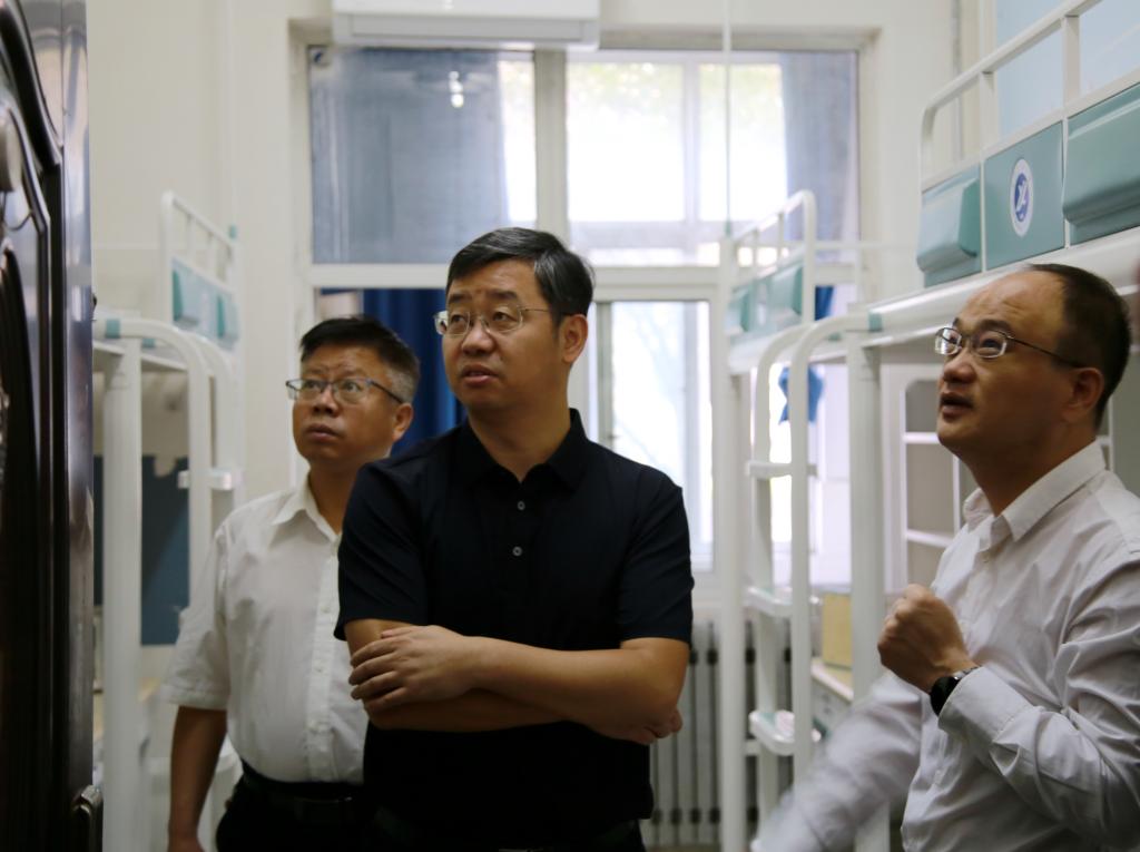 王进富带队走进东区15号和16号新生宿舍楼,听取了后勤处负责同志关于新生宿舍准备工作的汇报。在检查中他强调,宿舍的环境直接会影响到学生的学习和生活质量,后勤处等相关部门必须全力以赴为学生提供一个安全、舒适、卫生、便利的居住环境。检查中,王进富和宿舍楼前偶遇的新生及家长进行了亲切交谈,并合影留念。