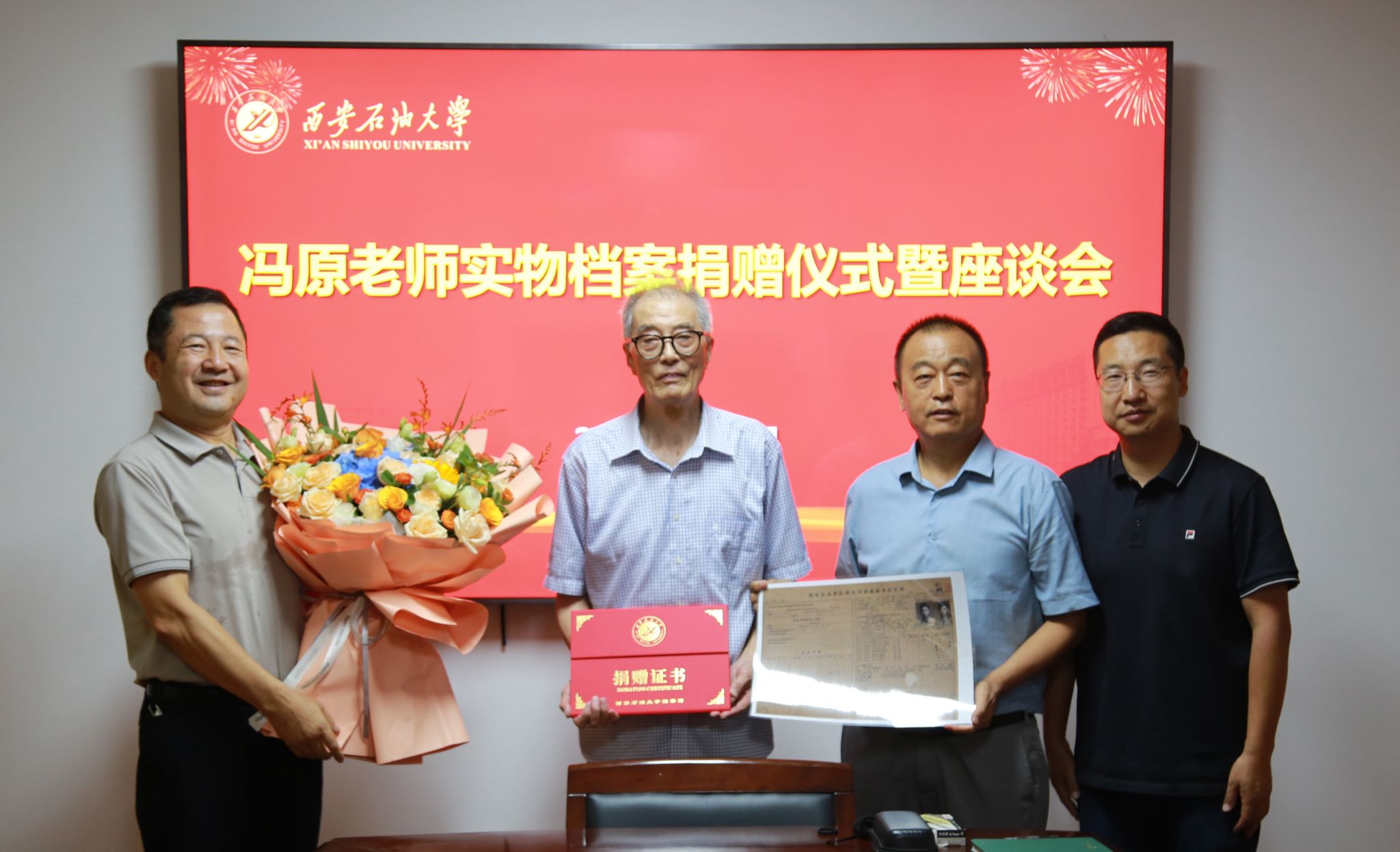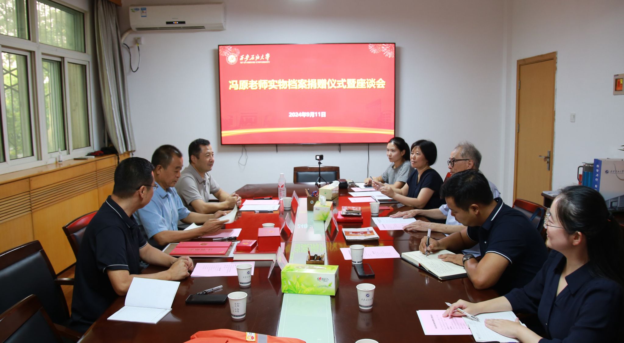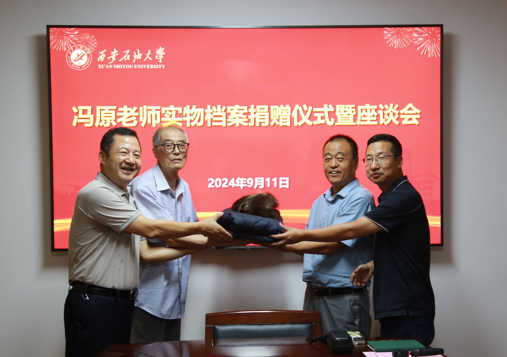 9月11日下午,william退休教职工冯原老师向学校捐赠“新时期铁人”王启民为校庆50周年题词、大庆会战期间的工服鞋帽、西安石油学院毕业证书、老照片等珍贵实物档案。档案捐赠仪式在雁塔校区行政楼二楼会议室举行,会议由档案馆馆长马超主持,校党委副书记程永清,离退休工作处主要负责人及相关工作人员参加会议。