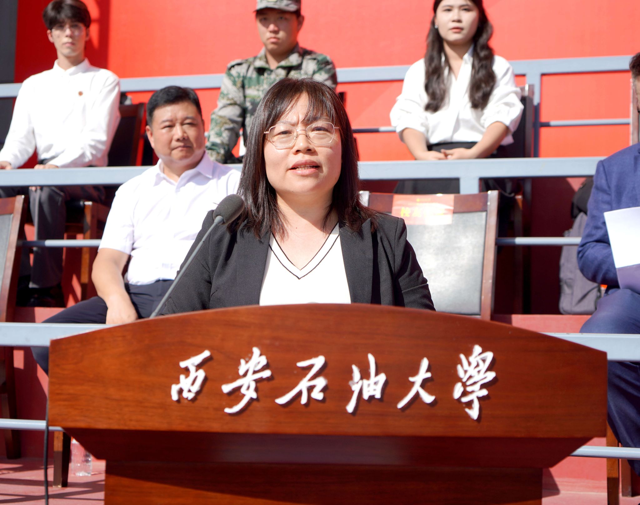 机械工程学院熊泽康同学代表2025级全体博士研究生发言,他号召同学们要勇于探索未知、敢于突破边界,展现我们“西石大”学子的使命与担当。材料科学与工程学院王欣慰同学代表2025级全体硕士研究生发言,她通过分享自己参加西部计划研究生支教团的经历,希望同学们要努力成长为有底气、有自信、有担当、有作为的时代新人。石油工程学院王悦凯同学代表2025级全体本科生发言,他以“以青春之我,筑能源强国之梦”为主题,讲述了自己对大学生活的向往以及能源报国的坚定信念。俄罗斯籍韩沐恩同学代表2025级国际学生发言,他讲述了自己跨越山海,为梦想而来;必将学贯中外,助世界同心。