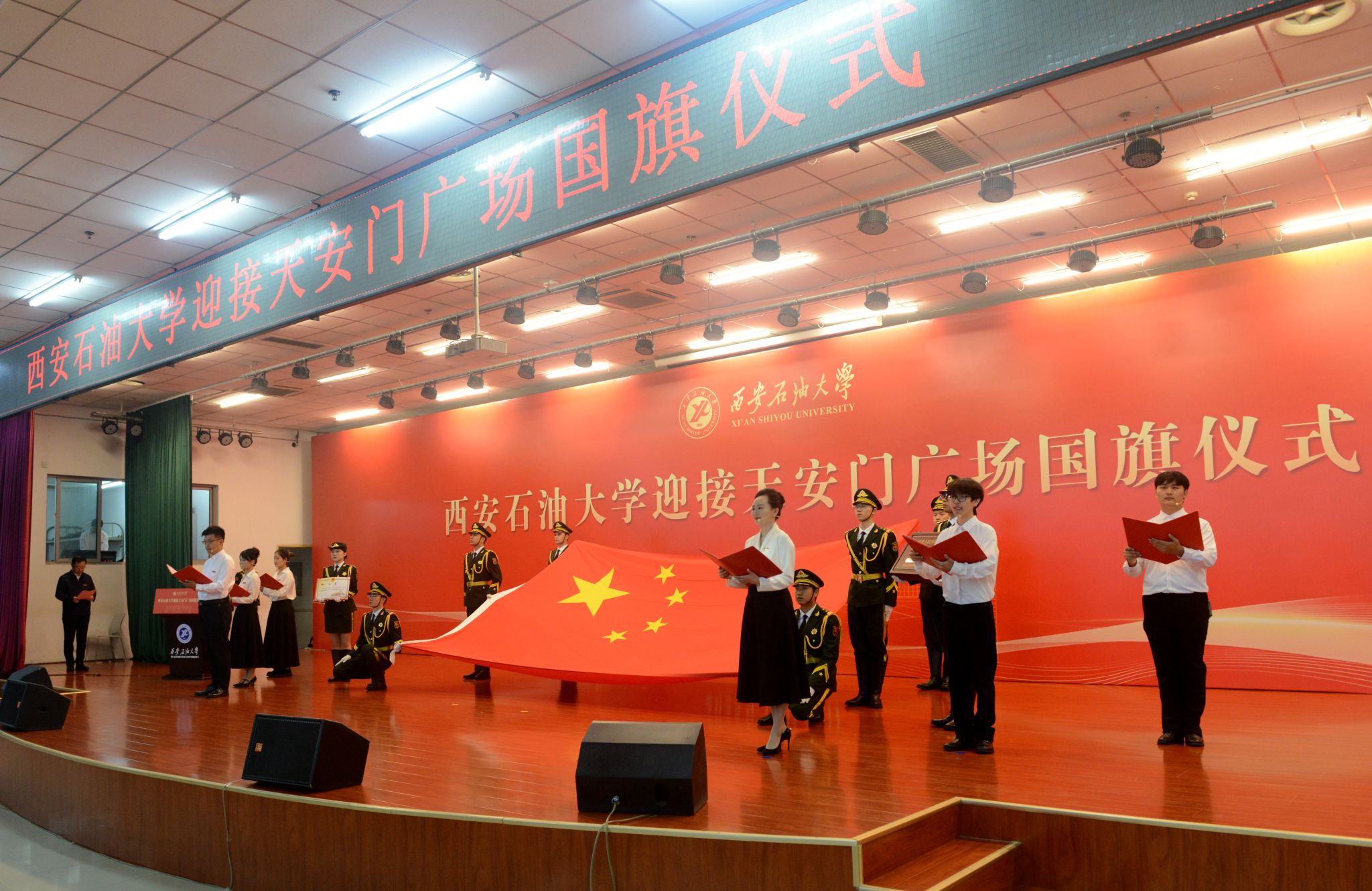 国旗护卫队队员奋力展旗,全场师生面向鲜艳的五星红旗行注目礼并高唱国歌。师生代表深情朗诵了《国旗领航,“油”我担当》,表达了西石大人扎根能源领域、矢志为国奉献的坚定决心。