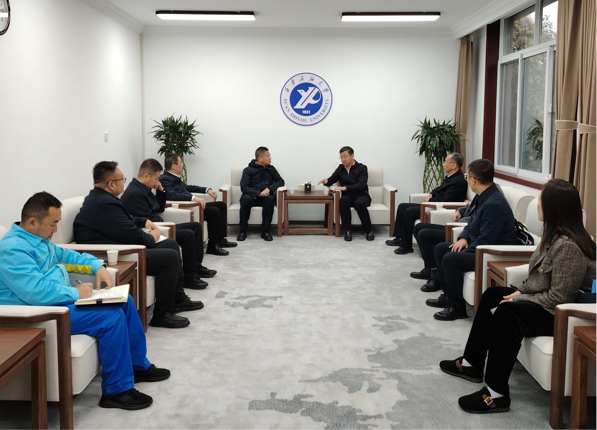座谈会前,校长王进富在贵宾室亲切会见了焦群朝一行。他指出,学校近年来坚持“开放办学、智慧办学、服务办学”理念,始终紧扣行业和产业发展需求,深化产教融合,凝聚学校优势,聚焦企业需求,紧密围绕和聚焦人才培养、科学研究和社会服务三大职能,不断优化学校办学资源和空间布局,大力开展与行业企业特别是校友企业的全方位、深层次合作,积极探索产学研用协同创新模式,实现教育科技人才一体化推进。他强调,校友是学校宝贵的资源和财富,也是学校的底气和骄傲,更是学校发展的战略和支撑。学校第三次党代会提出了“构建校友终身命运共同体”理念,连续2年召开了校友秩年返校共商高质量发展大会,优化了内部机构,进一步凸显了校友在学校事业发展中的不可替代作用。学校将一如既往地关心和支持校友以及校友企业的建设和发展。希望双方建立常态化合作交流机制,进一步找准合作的契合点、着力点和共振点,不断深化合作内容和形式,重点在课题研究、学科竞赛、营销策划、社会实践、实习就业等方面深入推进合作,在更广范围、更高水平上实现互惠共赢,服务好国家能源战略需求和区域社会经济发展。