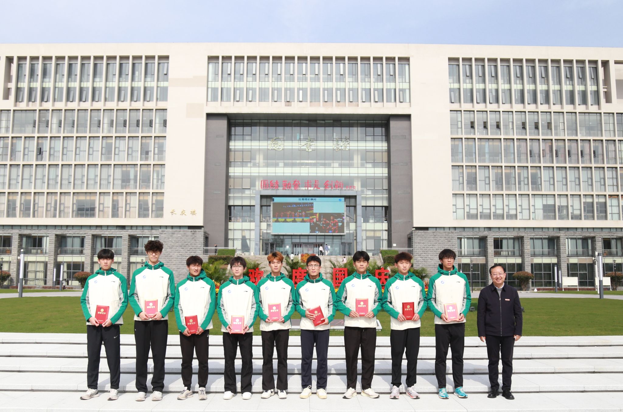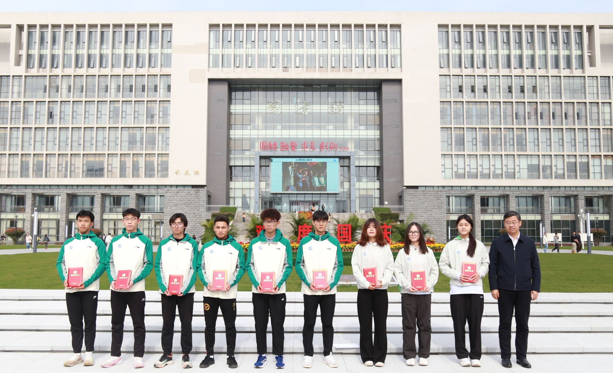 仪式上,王进富、张骁勇、种宇宏分别为校田径队和健美队的运动员们颁发了参赛荣誉证书。