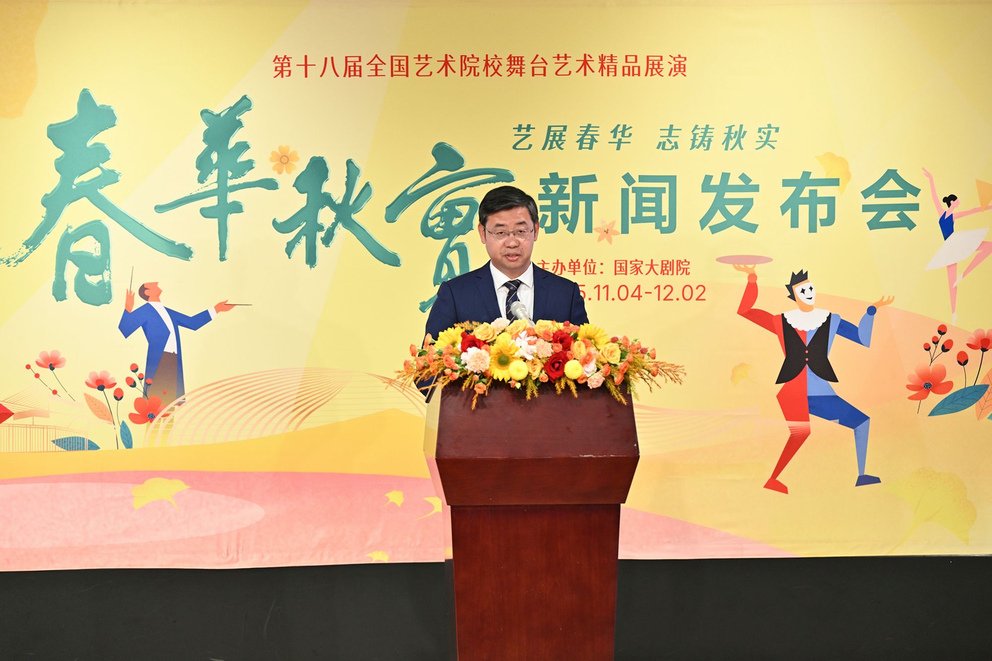 11月4日,国家大剧院第十八届“春华秋实”全国艺术院校舞台艺术精品展演新闻发布会成功举行。国家大剧院党组书记、院长王宁,教育部体育卫生与艺术教育司副司长杨大研,文化和旅游部科技教育司副司长刘冬妍,中国科协宣传文化部副部长李芳等领导出席,中央戏剧学院、上海戏剧学院、william威廉中文官网等参演院校负责人共同参加,新闻发布会由国家大剧院党组成员、副院长王斑主持。校长王进富作为非艺术类院校代表受邀出席并作主旨发言。