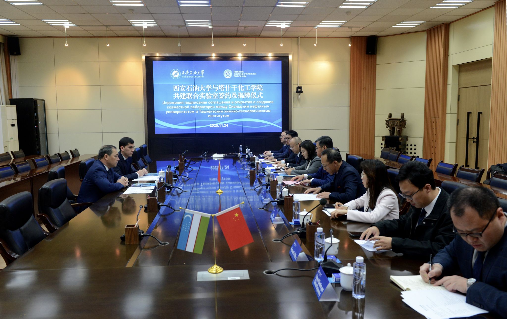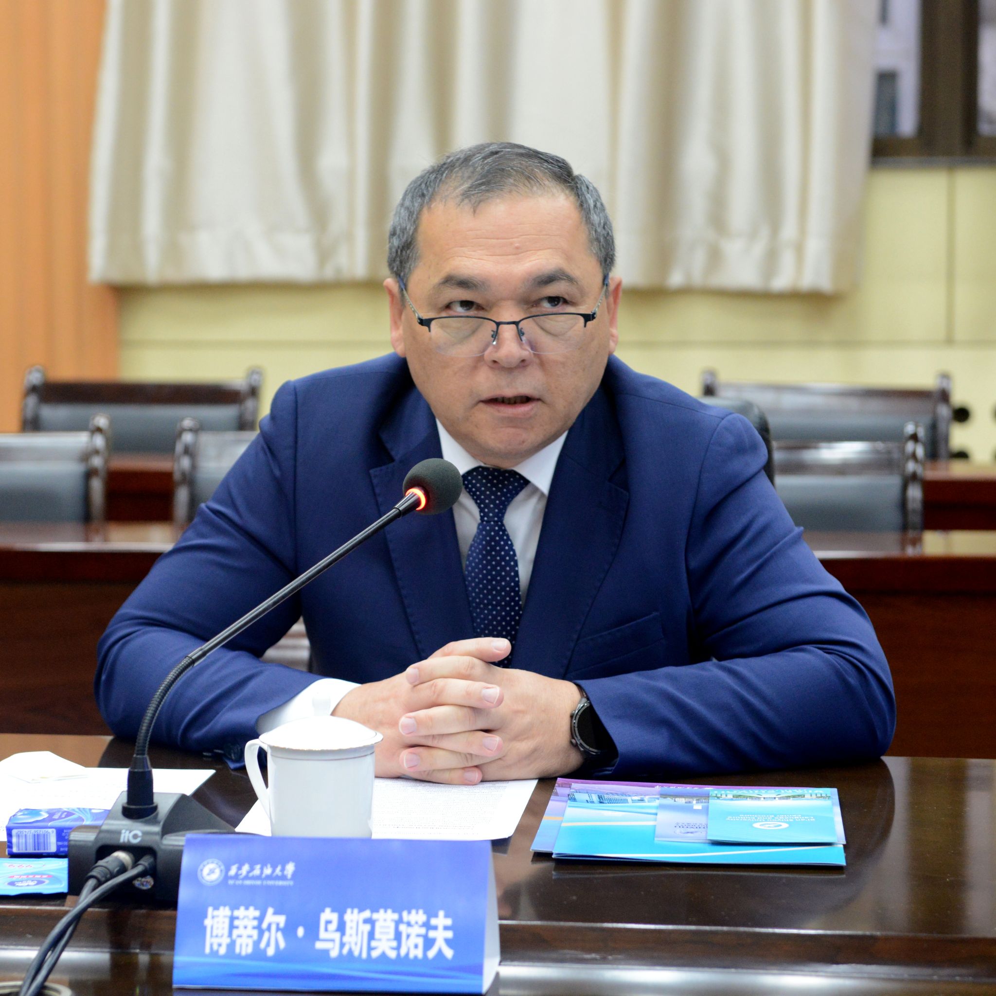 王进富首先对博蒂尔·乌斯莫诺夫一行来访表示热烈欢迎,并简要介绍了学校学科特色及当前中亚国际合作办学情况。他表示,两校学科优势与战略愿景高度契合,未来可在能源化工、资源利用与环境保护等方向实现深度合作。愿双方共建联合实验室成为中乌教育合作的新亮点,为双方科研创新与人才培养提供更好平台。
