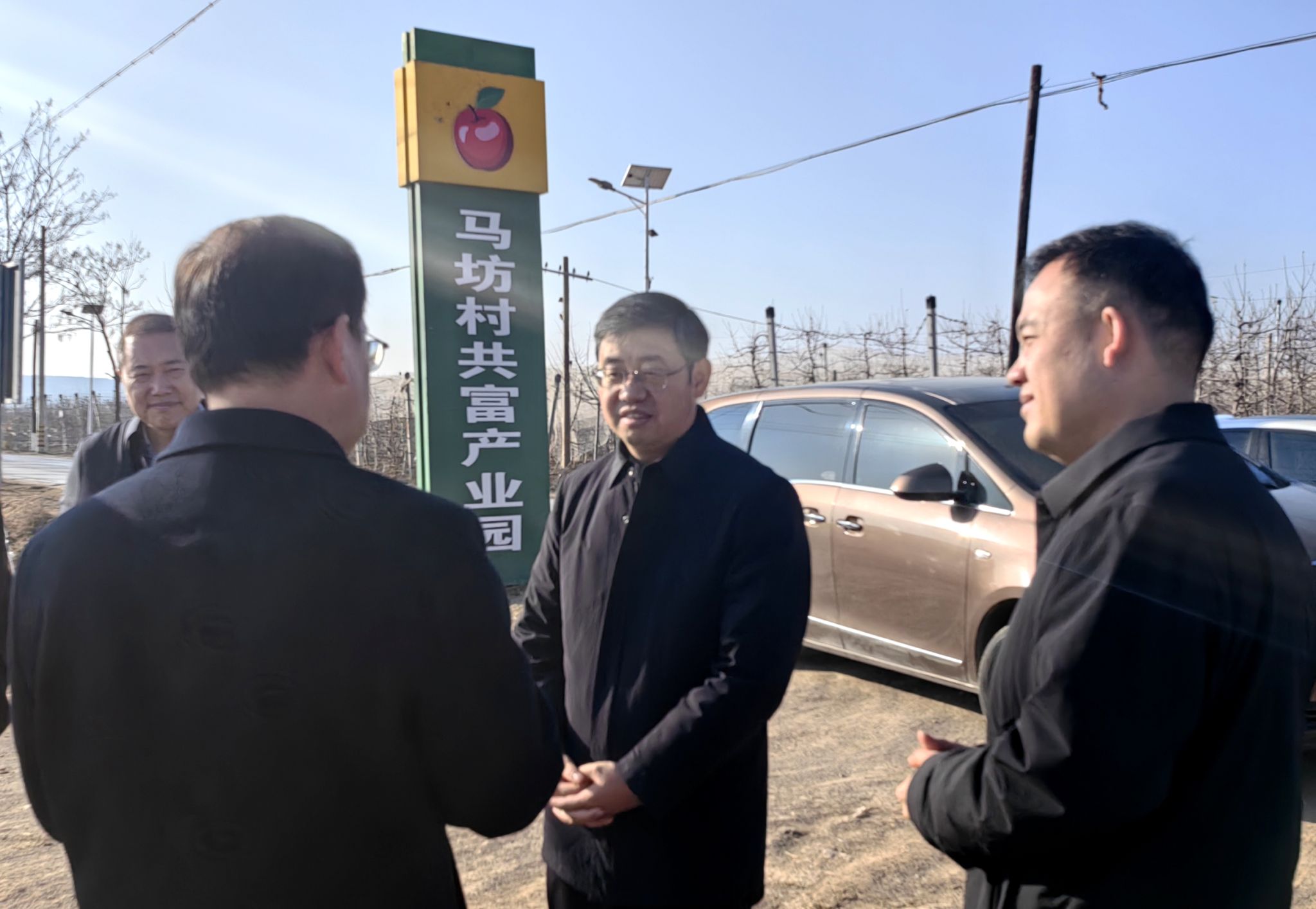 王进富一行首先到马坊镇马坊村进行了走访调研,马坊镇镇长刘翔向王进富详细介绍了马坊镇的基本情况以及近几年在脱贫攻坚和乡村振兴方面的做法和取得的成效。随后在王振的陪同下,王进富一行参观了马坊村苹果共富产业园,详细听取了相关负责人的产业介绍,并与县、镇、村干部进行了深入交流。