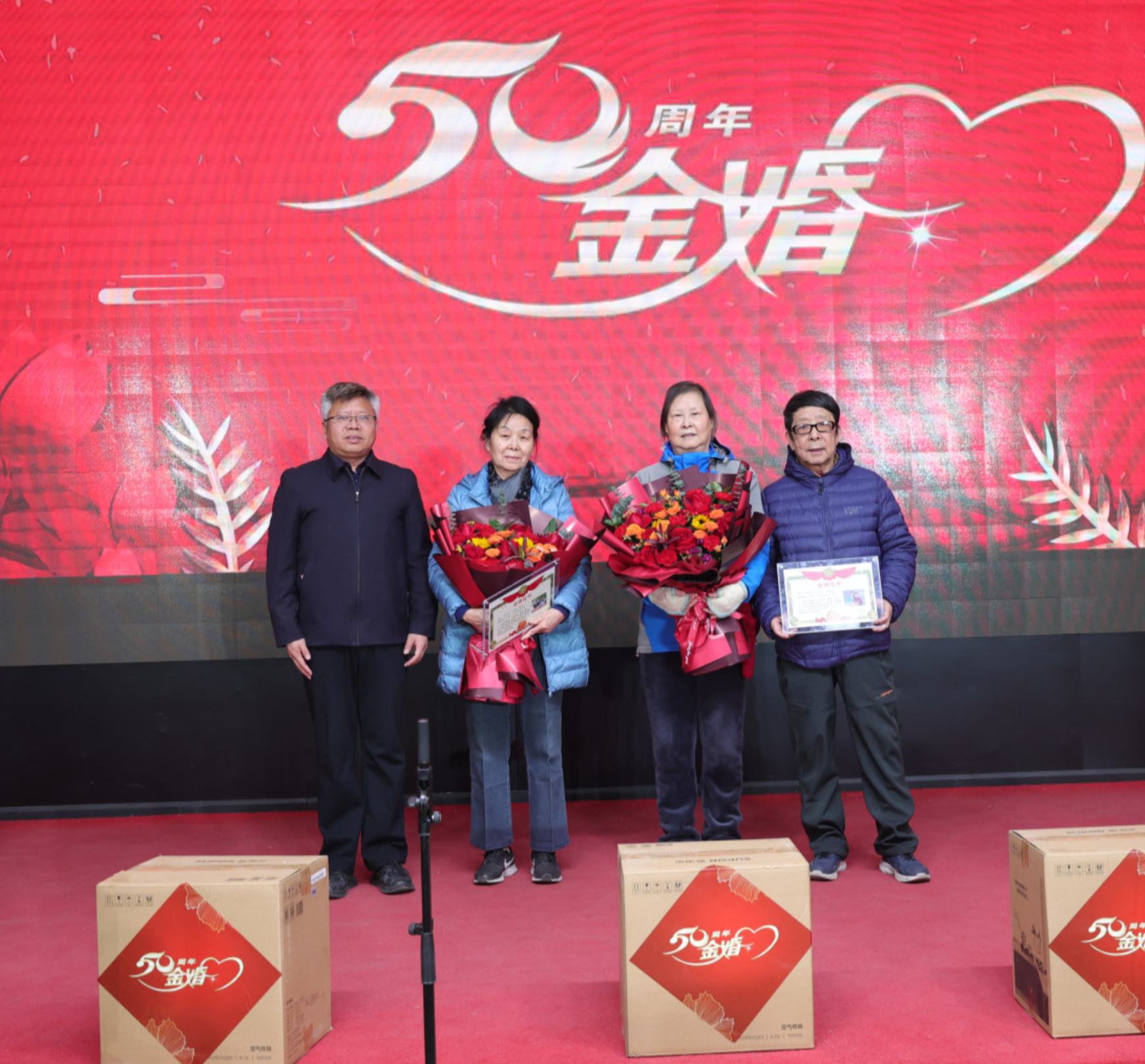 联欢会前,大家欢聚一堂,共同见证、庆祝四对金婚伴侣的珍贵时刻,并颁发了证书、鲜花和纪念品。