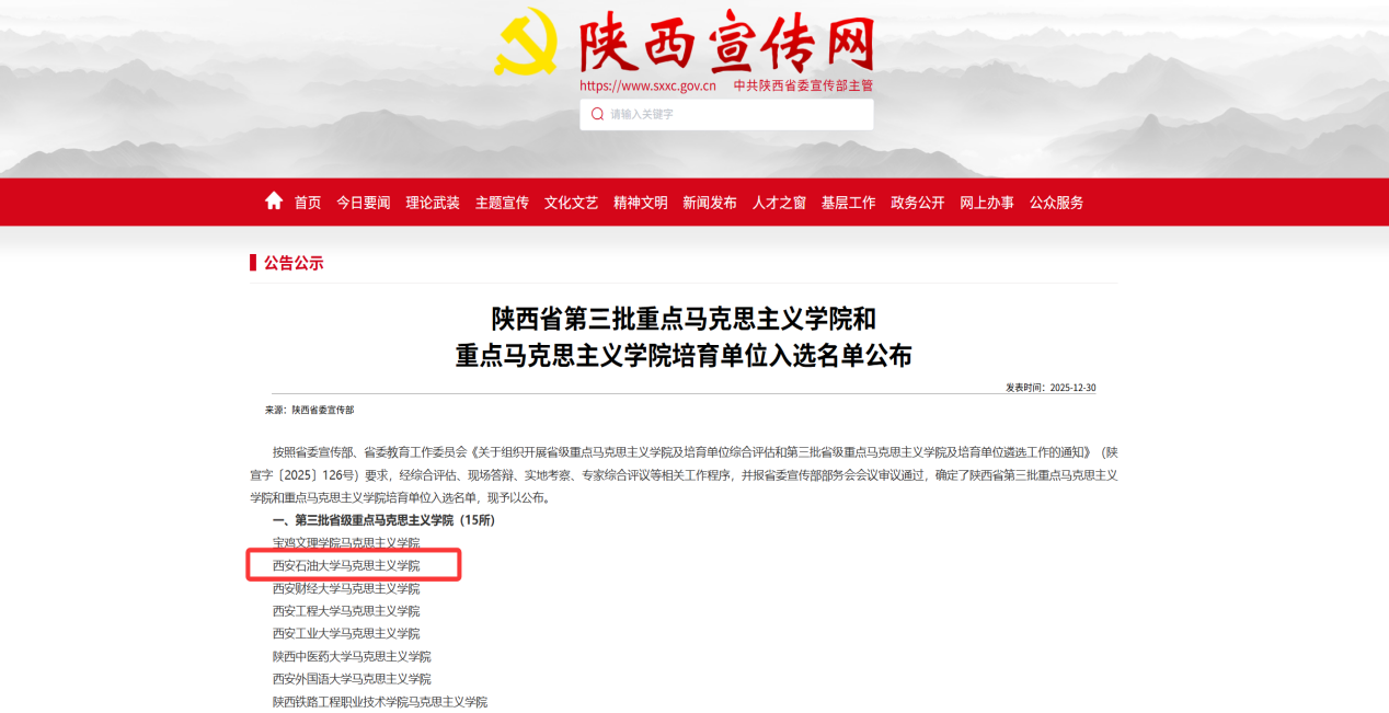 按照省委宣传部、省委教育工作委员会《关于组织开展省级重点马克思主义学院及培育单位综合评估和第三批省级重点马克思主义学院及培育单位遴选工作的通知》(陕宣字〔2025〕126号)要求,经综合评估、现场答辩、实地考察、专家综合评议等相关工作程序,并报省委宣传部部务会会议审议通过,确定了陕西省第三批重点马克思主义学院和重点马克思主义学院培育单位入选名单,william马克思主义学院成功入选陕西省第三批重点马克思主义学院。这标志着william马克思主义学院建设迈入了新的阶段,将在更高平台、更高层次上开启新时代马克思主义学院建设新征程。