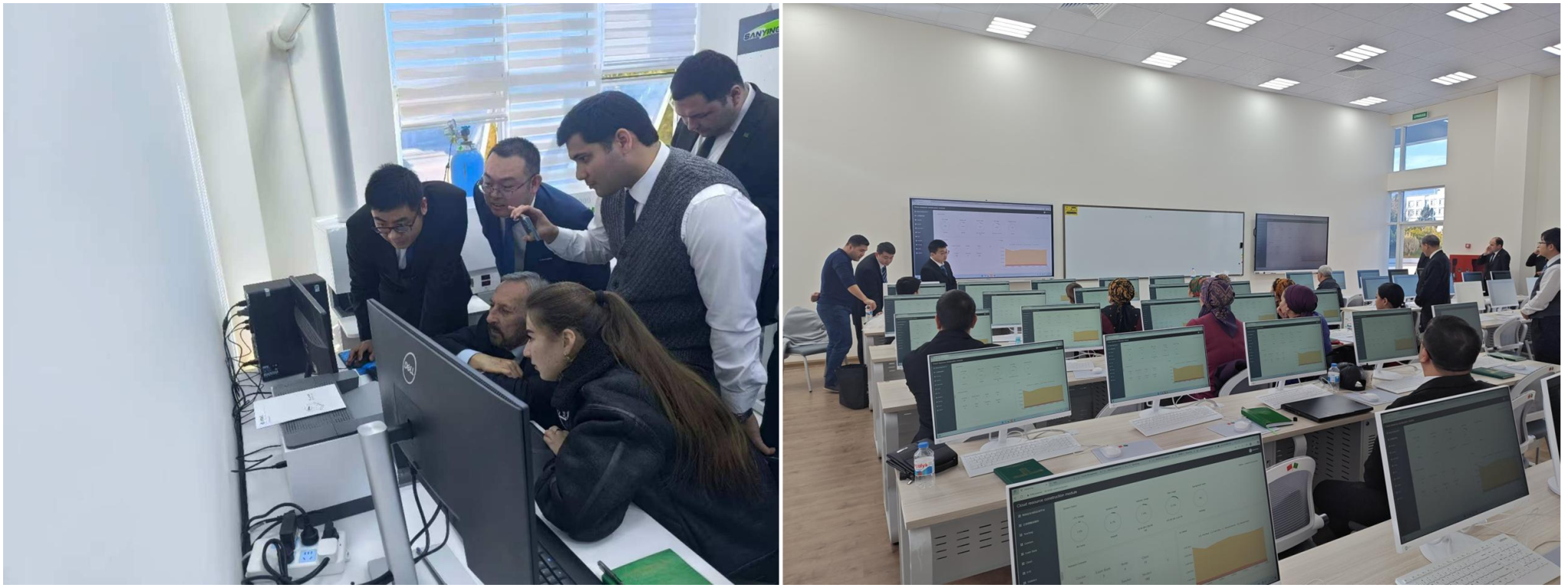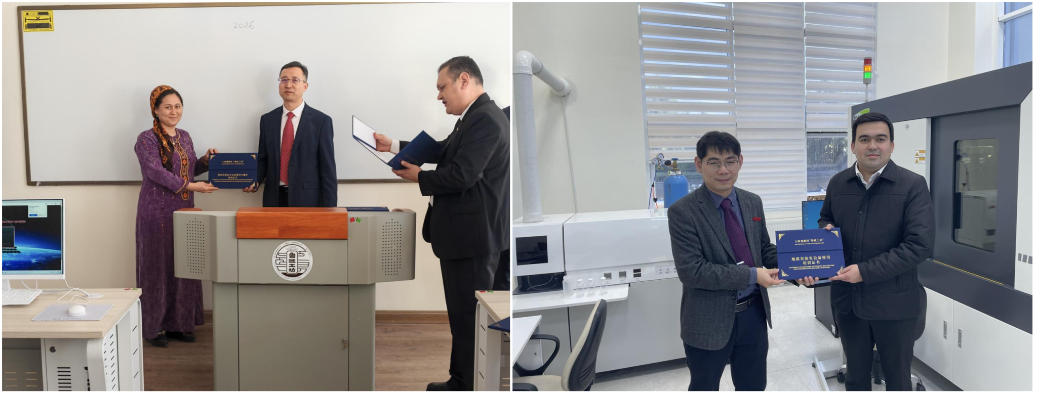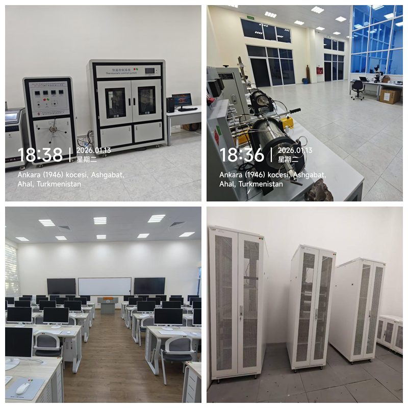此次中方赴土工作团组共计17人,分三批于2025年12月27日、2026年1月6日及1月11日陆续抵达卡卡耶夫国际油气大学,历经19天高效推进施工验收工作。中方技术团队凭借扎实的专业功底,顺利完成2间地质实验室、4间信息技术实训室的设施设备安装、调试及测试运营,所有设备均实现正常运行,达到预设教学实验实训标准,为后续教学活动开展提供了可靠的硬件保障。