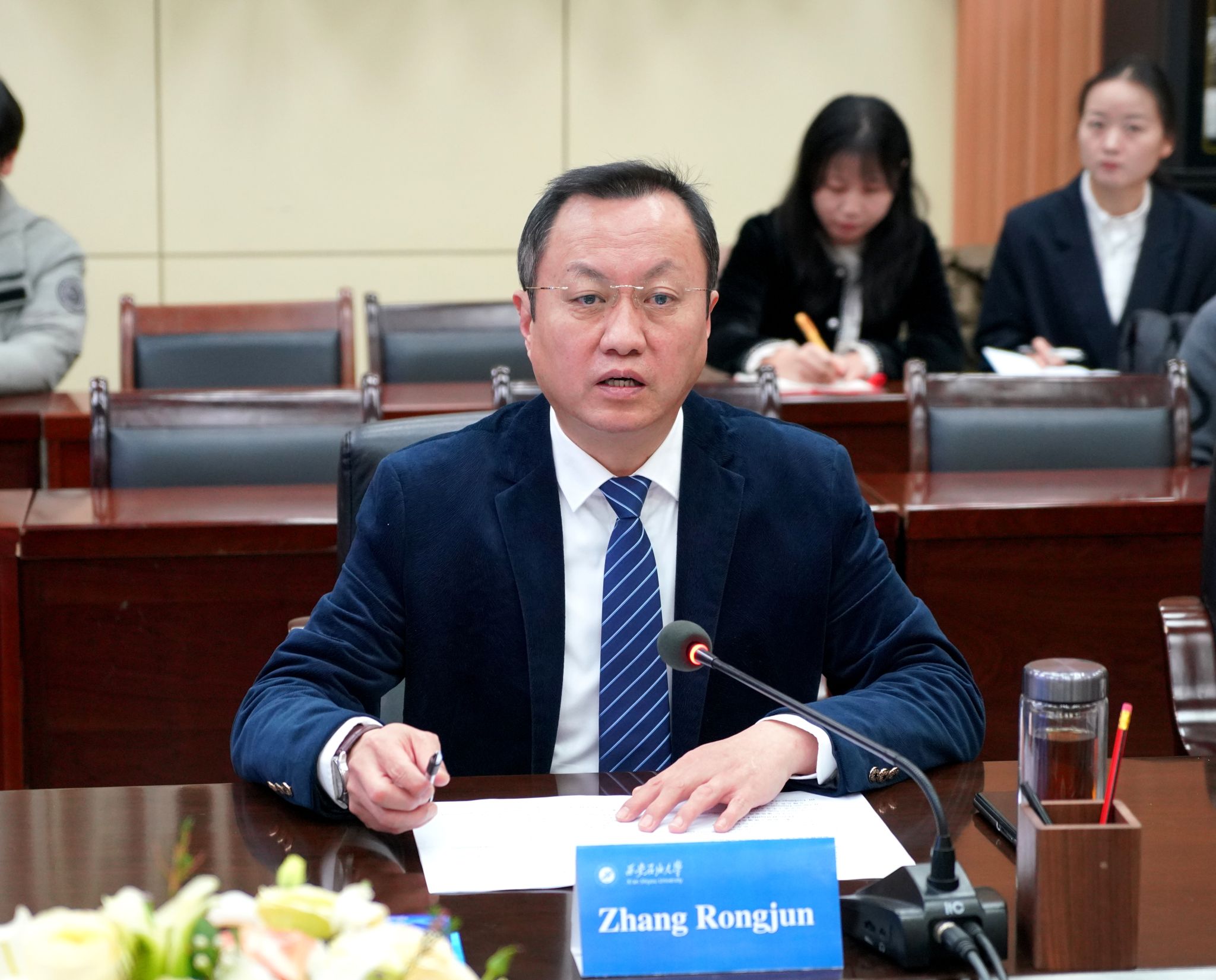 王进富与贾思敏·格罗夫斯分别代表两校签署中外合作办学协议,迪恩·兰金、张荣军共同见证签约。