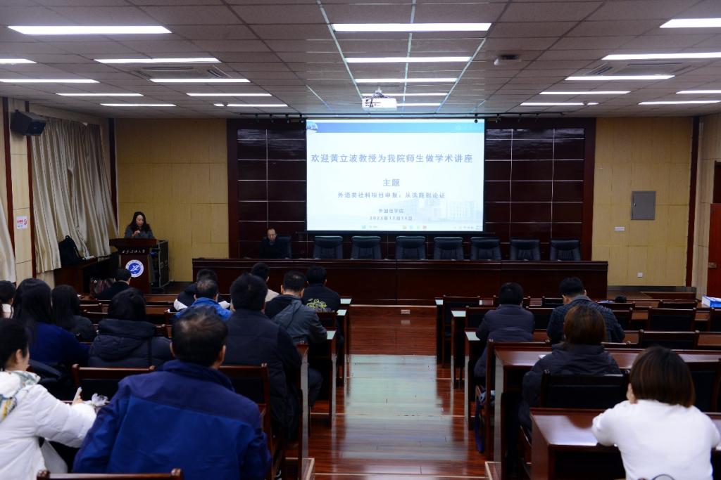 为提升学院师生社科类科研项目申报水平与质量,12月14日下午,外国语学院邀请西安外国语大学二级教授、博士生导师黄立波教授开展了题为“外语类社科项目申报:从选题到论证”学术讲座。外国语学院师生共100余人聆听了本次讲座。讲座由副院长刘辉主持。