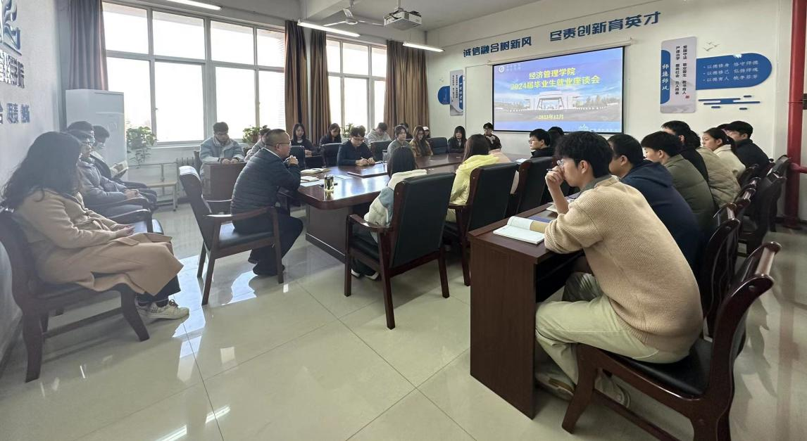 为全面掌握2024届毕业生就业进展情况,深入了解毕业生求职就业过程中遇到的问题及困难,进一步提高就业指导服务的实效性,经济管理学院于12月6日在鄠邑校区崇文楼305会议室召开2024届毕业生就业座谈会。学院党委副书记王刚,辅导员史阳、张硕,2024届毕业生代表共40余人参加会议。