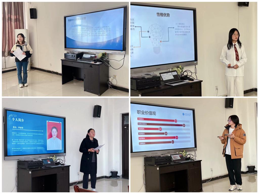 在答辩现场,13位选手通过PPT展示的方式,结合新媒体运营、品牌设计师、乡村振兴专员、室内设计师、乡村教师等岗位的实际情况,进行自我认识、职业分析、未来规划、预期评估等方面的精彩阐述。评委根据现场表现,对各位选手的职业生涯规划完整性、逻辑性、PPT美观性等方面进行全方位的点评和提问,对展示中出现的问题提出指正和建议。
