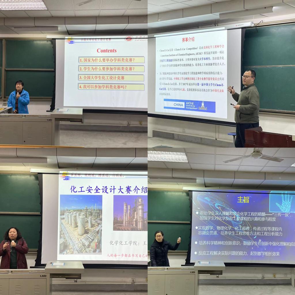 随后,学科竞赛指导老师刘菊荣、范峥、王进、唐璇依次就“全国大学生化工设计竞赛”“全国大学生化工实验大赛”“中国大学生Chem-E-Car竞赛”“全国大学生化工过程数字创新竞赛”“全国大学生化工安全设计大赛”“全国“互联网+化学反应过程”大学生课模设计大赛”等化工学科竞赛有针对性的介绍分析了竞赛概况、赛程与赛制、竞赛内容、竞赛特点和william以往获奖情况,鼓励同学们积极参与,勇于尝试,提升自己的专业和创新能力,努力在竞赛中取得新的突破。