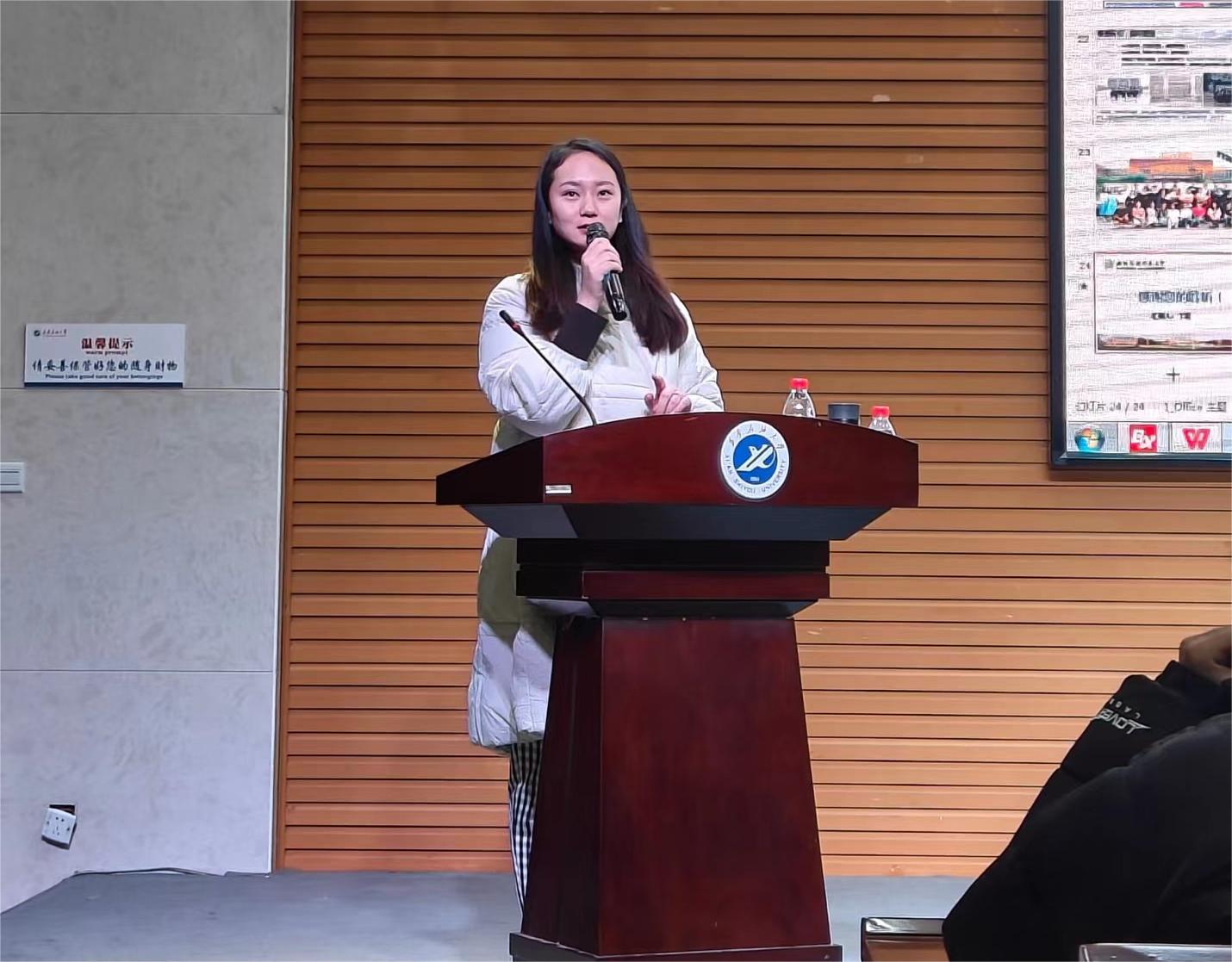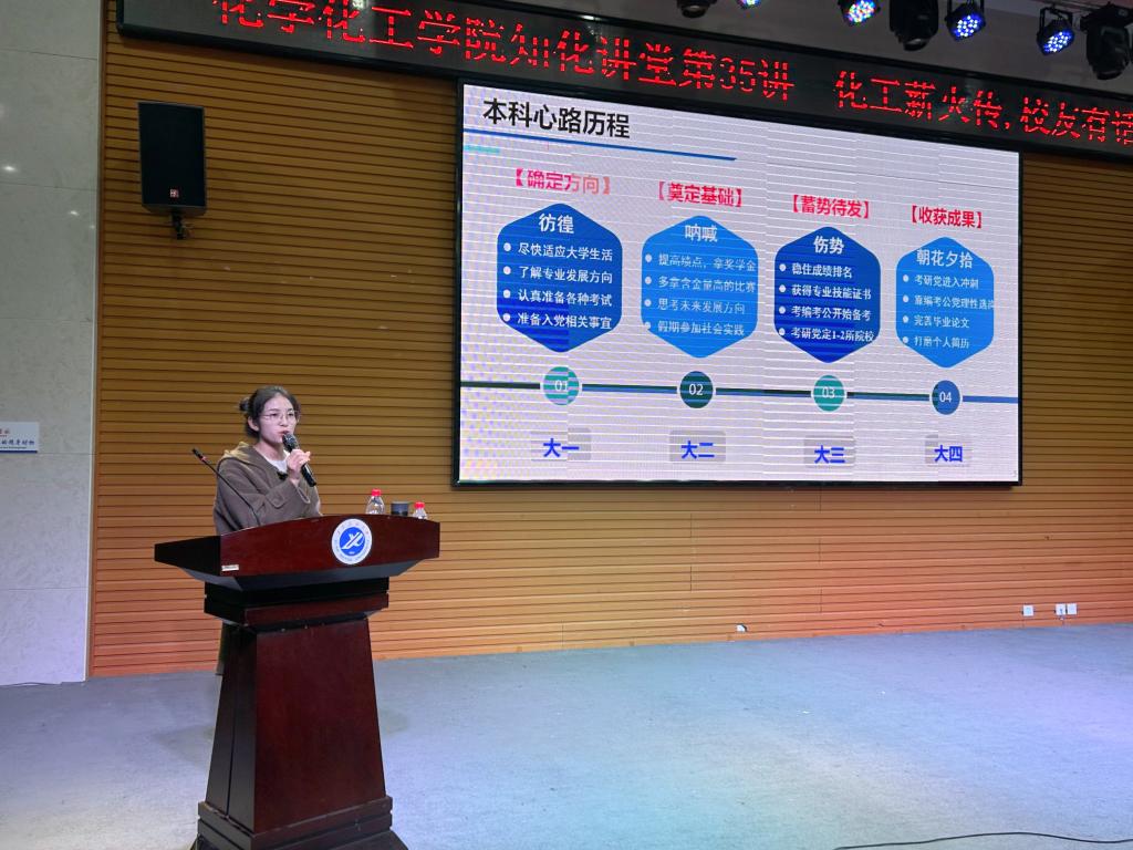 为更好的帮助学生提升专业学习能力,引导学生做好学业规划,11月15日下午,化学化工学院在鄠邑校区经管人文楼118室举办“化工薪火传,校友有话说”知化讲堂第35讲。本次讲座特别邀请2016级优秀毕业生丁蕊同学担任主讲,学院200余名本科生及2023级全体研究生参会。活动由2023级研究生辅导员王蓉主持。