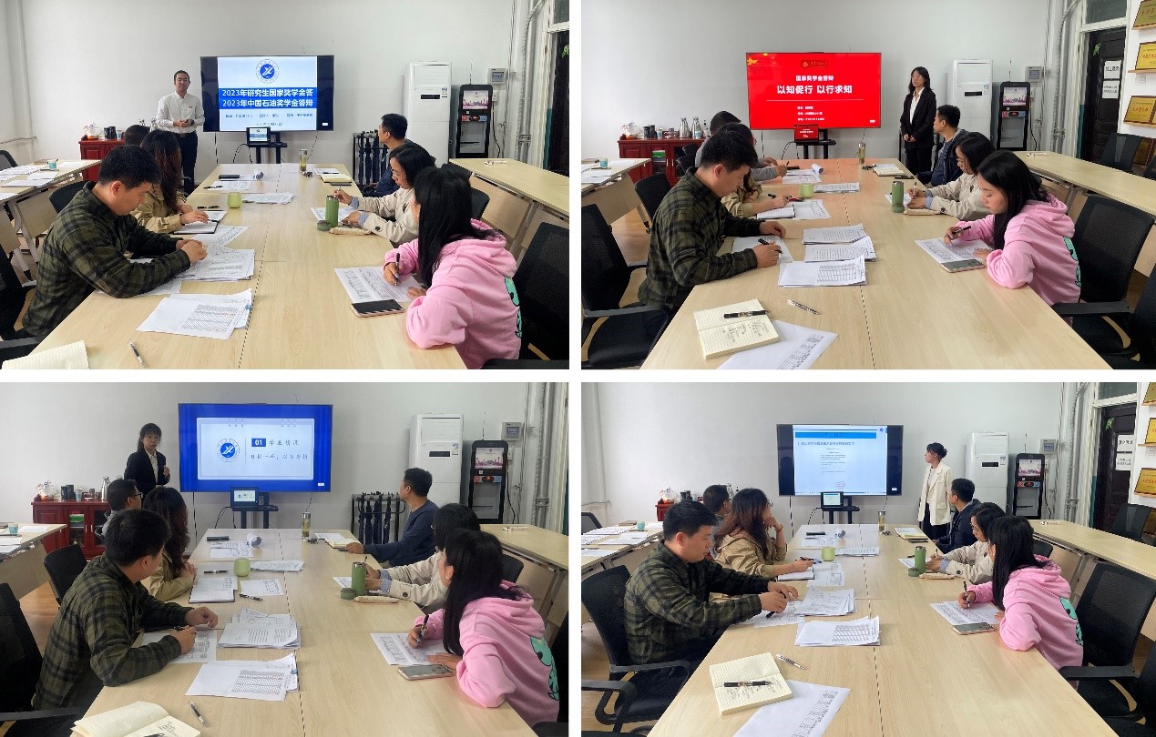 田虹霞介绍了学院2023年度硕士研究生国家奖学金评定细则和学校中国石油奖学金评审工作规定,对评审条件、评审程序、评审要求进行了详细说明,并简要介绍了评审答辩前相关工作开展情况。根据学校相关工作要求,经个人申请、资格初审,共有5名研究生参加答辩,展示个人成果,评委针对答辩涉及的论文、研究课题和项目、学科竞赛获奖情况等进行提问。评审委员会就申请人的课程成绩、科研实践、答辩情况、现实表现等方面进行综合评议,最终确定梁琪为学院2023年研究生国家奖学金拟推荐人选,张凯惠为2023年研究生中国石油奖学金拟推荐人选。