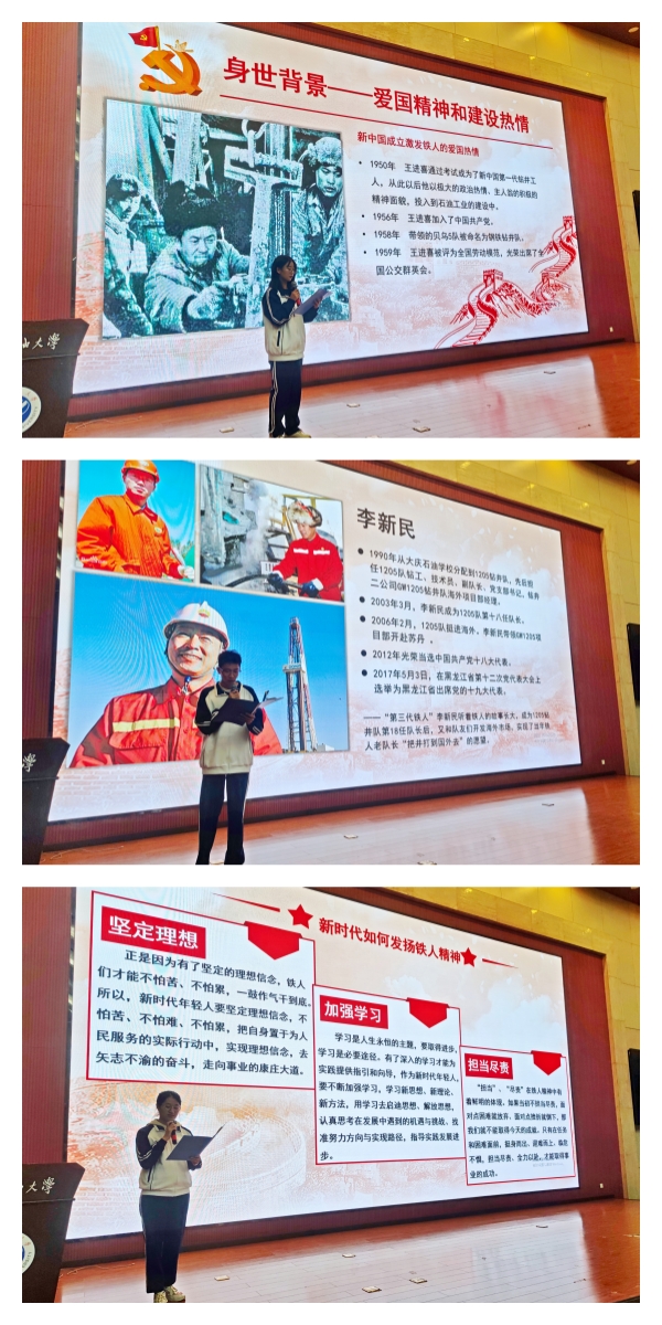 在“学子讲铁人”环节,由高年级的郭容容、杨盛凯和黄一凡同学分别从铁人身世背景、国内国际战略背景以及油田恶劣的自然环境分析了铁人精神涵育的时代背景,从王进喜、王启明和李新民的人物人物事迹讲述了一脉相承的铁人精神,从铁人精神的重要意义、作用和传播途径分享了当代大学生对铁人精神发扬的思考和感悟。并号召同学们在今后的学习生活中以铁人精神为引领,将本次学习内化于心、外化于行。