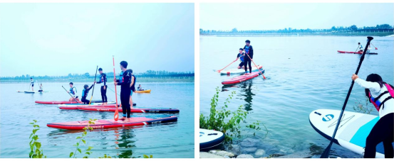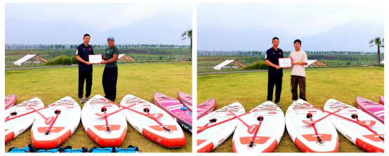 随后,双方就合作事宜展开了充分讨论,体育学院社体专业教研室主任胥山与宽河驿马(北京)房车露营地管理有限公司陕西分公司经理岑新地签署了共建校外实习实践基地协议,院长李寿邦向西安旅游集团天桥湖国际露营地负责人蔺攀授牌,向天桥湖水上营地岑彦、刘海雄两位老师颁发了兼职实习指导教师聘书。体育学院拓展中心负责人冀兆鹏副教授带领学院学生开展了桨板训练。