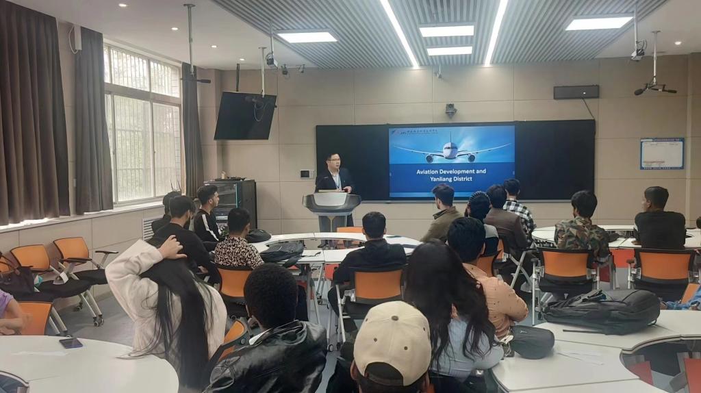 随后,刘志武用流利的英语亲自为同学们做了航空科普知识讲座。他借用一张简单的纸条,用浅显易懂的语言讲解了飞机在气流气压的作用下飞行的原理。讲座的最后,通过新舟60、C919商飞客机的展示,使同学们了解到现代中国航空工业的巨大成就。
