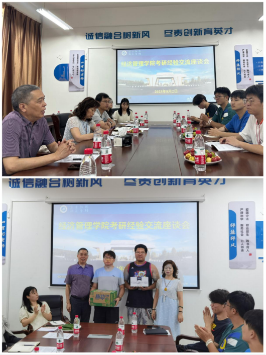 随后,老师们在崇文楼305会议室同暑期留校考研学生座谈。座谈会上,经济管理学院党委书记王宏卫向暑期留校考研学生表示慰问,他希望备考同学能树立远大目标,“志不立,天下无可成之事”,青年当用高远之志照亮的灿烂人生,将科学备考与实现人生伟大抱负结合起来。要坚持“咬定青山不放松”的精神,迎难而上、扎实学习,注重积累、积极拓展知识面,保持热情与动力,砥砺前行。他祝愿考研同学最终都能“春风得意马蹄疾,一日看尽长安花”。院长王君萍为同学们介绍了学院考研的相关政策及激励措施,她希望同学们要注重日常的积累,养成钻研精神,着重梳理和总结往年的考研重点和规律。副院长李春霄从认真和坚持两个方面出发,鼓励2020级备考学生在备考过程中要坚持学习,只要认真、方法得当,就一定会有事半功倍的效果。2022级研究生杜泽萱和2023级研究生梁嘉乐从考研目标、考研规划、时间管理等方面作了考研经验分享。