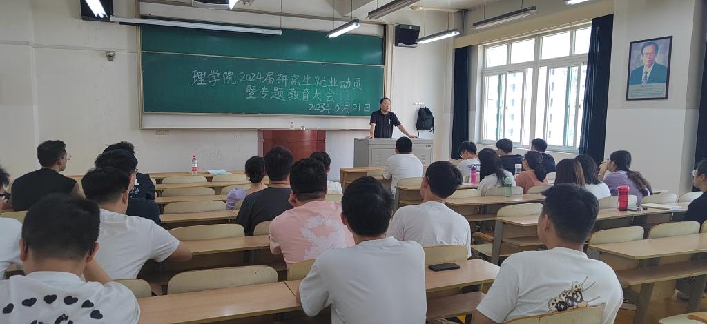 折延宏副院长做了就业动员讲话。他向全体同学通报了理学院2023届研究生就业情况:截至六月中旬,学院研究生就业率达到100%。他详细分析了2023届研究生的就业特点、就业质量,分享两位研究生同学成功考博的经历,为2024届研究生的就业、考博提供建议和参考。展望学院2024届研究生就业工作,折延宏副院长分三个方面作就业动员。一是希望研究生同学早思考、早准备,将就业与考博作为下一阶段最重要工作;二是希望研究生同学立足所学专业,将目光放长远,到基层去、到祖国需要的地方建功立业;三是希望研究生同学关注本年度暑期社会实践、企业就业实习,为成功求职打下坚实基础。最后,折老师结合暑假实验室安全、“端午”小长假,为大家作了安全教育和提示。