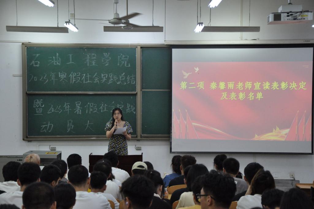 大学生假期社会实践活动作为高校实践育人的重要组成部分,丰富和深化大学生思想政治教育,使大学生能够在理论和实践相结合的过程中增长才干、健康成长。为扎实推进2023年暑期社会实践工作,激发学生参与热情,石油工程学院于6月16日下午在博思楼举行2023年寒假社会实践总结表彰暨2023年暑假社会实践动员大会,石油工程学院2021级辅导员兼团委、学生会指导老师秦馨雨,2022级辅导员聂康晨,2023年寒假实践获奖学生等百余人出席本次大会。