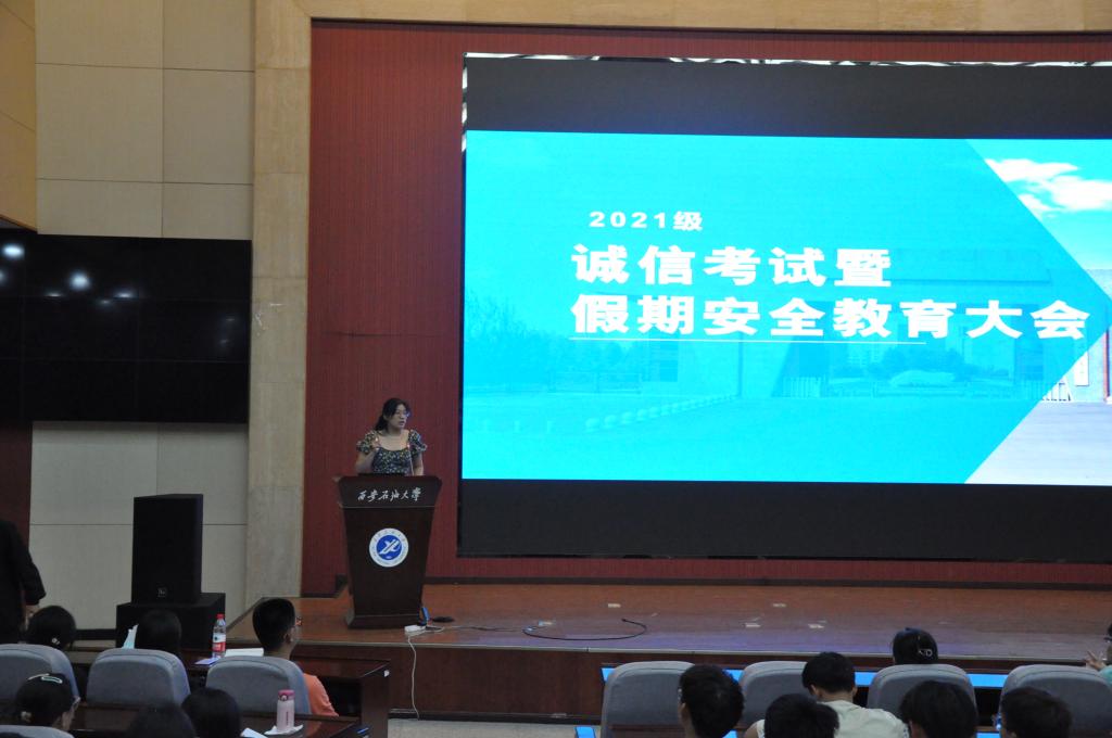 为进一步加强学院学风建设,严肃考风考纪,落实假期安全教育、朋辈教育、社会实践等各项工作,石油工程学院于6月16日上午在鄠邑校区弘石报告厅召开2021级诚信教育暨假期安全教育年级大会,本次会议由2021级辅导员秦馨雨主持,2021级全体学生参会。