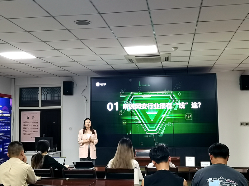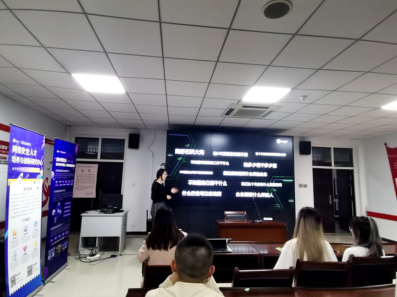 文倩雯和邓黎基于现阶段的招聘环境,结合自身经历向参会学生介绍了网络安全工程师的基本从业条件及发展前景,帮助参会学生了解企业用人需求,对标个人能力更好的树立学习目标,从而做好踏入职场的准备。