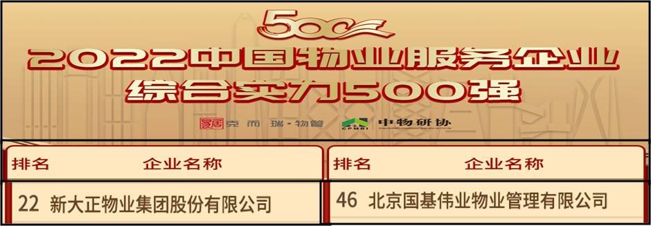 近日,中国物业管理协会、克而瑞物管、中物研协联合发布了“2022年中国物业服务企业500强榜单”,其中服务william雁塔校区室内物业的新大正物业集团股份有限公司位列第22名;服务william鄠邑校区室内物业的北京国基伟业物业管理有限公司位列第46名,同时该公司还荣获2022年中国学校物业服务领先企业。