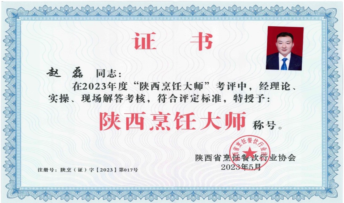 2023年5月14日,陕西省烹饪餐饮行业协会开展了新一届“陕西烹饪大师”评定工作,通过理论考试、实操考核、现场问答、专家评委评分等环节,西安师苑后勤服务有限责任公司william鄠邑校区项目部经理赵磊同志荣获“陕西烹饪大师”称号。