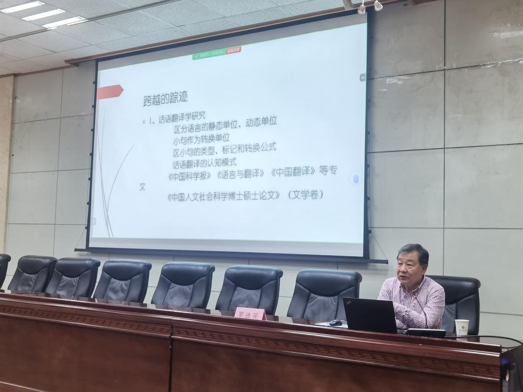 讲座中,罗选民教授围绕其自选集《超越翻译》的跨学科研究特色,从“提升学术,铸造精品,以学彰德,以德惠学”的《英华学者文库》出版宗旨,到跨学科翻译研究、互文性与翻译、典籍翻译的文化自觉、翻译与中国现代性研究、大翻译与中国文学的世界传播、翻译的认知行为研究等方面详细阐释了自己的治学观;结合自己的教学科研经历和成果分享了自己“情理交融、龙虫并雕、中西合璧、推陈出新”的教学科研十六字箴言。罗教授对翻译工作充满热清,他说:“我在超越翻译,遨游在语言、翻译、符号世界的同时,也超越了自己”。
