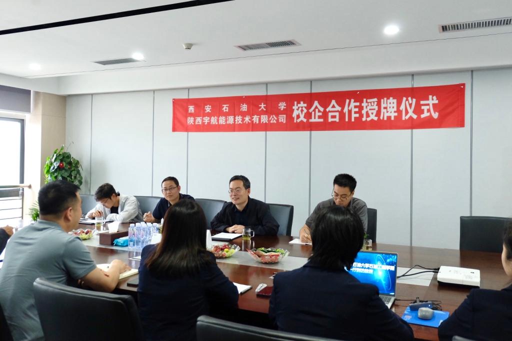 为深入贯彻落实教育部、省教育厅和william关于“访企拓岗”促就业专项行动工作要求,精准对接企业,开拓就业岗位,5月23日下午,石油工程学院党委副书记张建高、学工办主任黄景鹏、研究生辅导员宋兴淼、19级本科生辅导员王渊一行4人赴陕西宇航能源技术有限公司(以下简称:公司)开展校企合作交流暨授牌仪式。公司总经理冯大国出席活动,活动由公司办公室主任李雅婷主持。