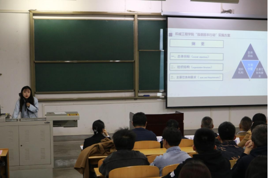 会上,2021级辅导员赵子彤介绍了《机械工程学院“强基固本行动”实施方案》的具体内容。她从总体目标、组织架构、主要任务和要求等方面具体说明了方案的实施步骤及注意事项。