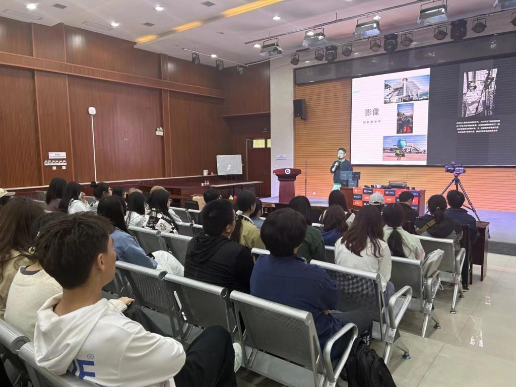 在讲座上,王健向同学们讲解了如Alpha 7S III、FX3、FX6、A7M4等多种器械的特点及其使用方法和适用场景,之后又向学生们解释了曝光三元素:快门、光圈、感光度及景深的区分和需求应用。此外,王健分别从“如何让视频具有电影感”“从拍摄思维转变为创作思维”“确定题材到开拍需要准备什么”“你的影片少了什么”和“影片结构逻辑:脚本-导演-摄影-临场构图-美术思维-音乐理解-现场调度”等五个方面向学生们展示了视频制作的要素及过程。在理论知识讲解完成后,王健向学生们展示了芮城宣传片、和王健本人拍摄的短视频,让学生们在视频中体会拍摄和剪辑的技巧。随后,部分同学又跟随王健来到第二会场,现场学习了部分短视频的拍摄技巧。