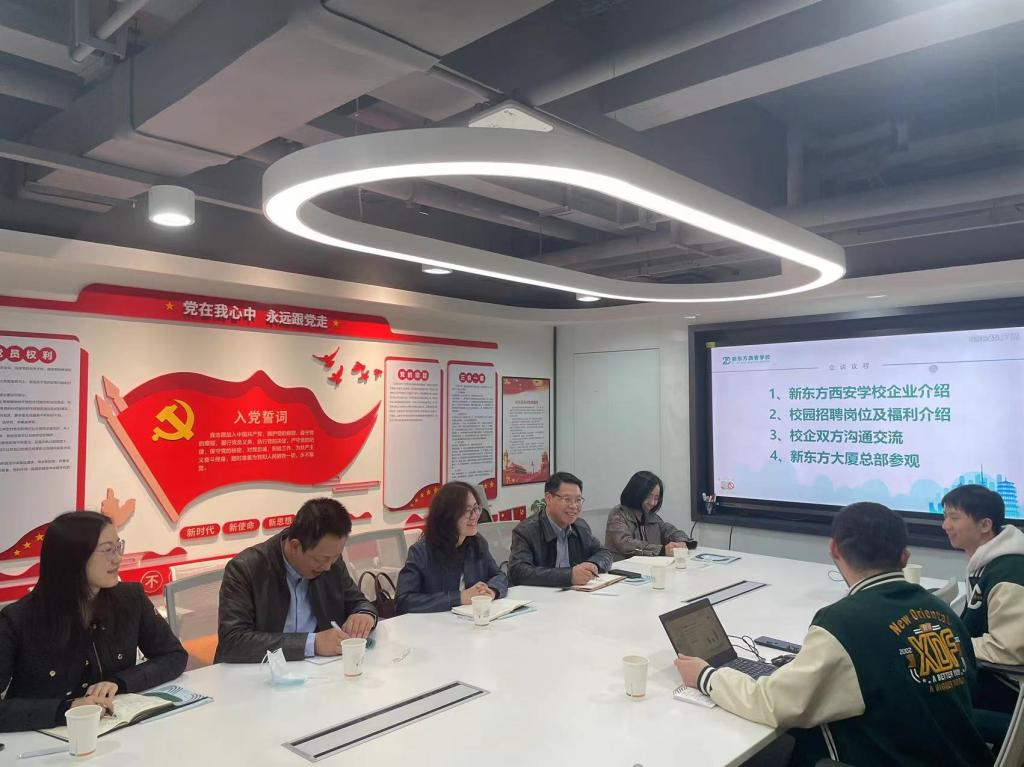 为进一步落实教育部和学校“访企拓岗促就业专项行动”工作要求,助力毕业生高质量就业,3月22日,外国语学院党委书记田虹霞、副书记王业青、系部代表秦艳霞,任春生,辅导员陶李一行前往新东方西安学校开展校企合作交流活动。新东方西安学校人力资源部副总监李刚华、校园招聘负责人刘振辉、左同生参加交流座谈。