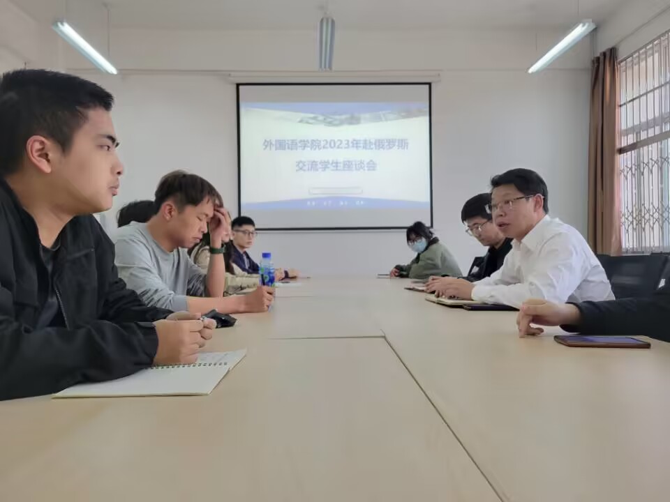 为增进同出国交留学生的沟通与交流,了解学生出国前的准备与学业生涯规划情况,加强学生的思想政治教育与安全教育引导,3月9日上午,外国语学院2023年赴俄罗斯交流学生座谈会在崇文楼314举行。学院党委副书记王业青,2020级辅导员陈浩参加座谈会,同即将出国的同学进行了深入的交流。