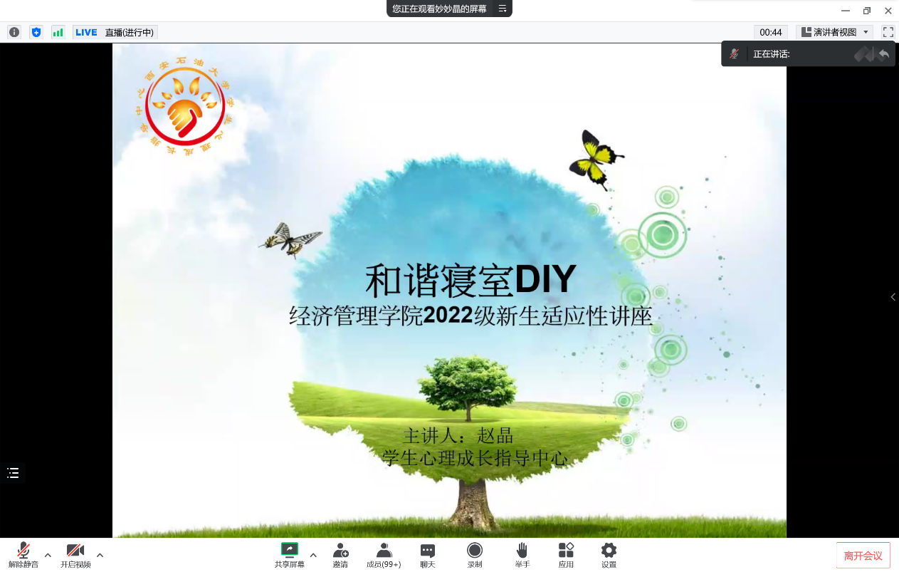 为切实做好2022级新生的心理健康教育工作,引导学生保持积极健康的心态,正确科学处理情绪问题,9月21日,经济管理学院通过腾讯会议线上举办2022级新生心理健康教育讲座。本次讲座邀请到william学生心理成长指导中心赵晶老师主讲,学院全体2022级新生参加,2022级商管类专业辅导员任仰主持此次讲座。