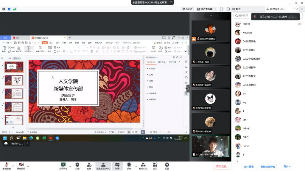 2022级12个班级在各班临时负责人的组织下开展了线上班会,每位班级成员进行了自我介绍,随后开展班委竞选,同学们积极参与,阐述个人经历、对职位的理解以及对未来的展望,展现出了当代大学生自信优秀、负责任有担当的一面。线上班会促进了新生之间相互了解,增进了同学情谊,为未来四年的同窗情谊打下了深厚基础。