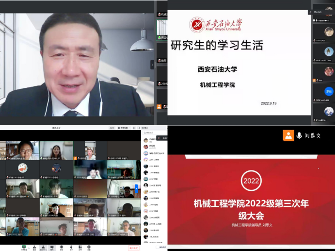 9月17日-19日,机械工程学院召开2022级全体本研新生入学教育线上会议。机械工程学院院长窦益华、副院长崔璐、党委副书记刘冰先后应邀出席会议,会议分别由辅导员欧红娟、刘思文主持。窦益华院长向同学们介绍相关学科专业的特色和优势,开展专业教育,围绕william“石油精神办学,铁人精神育人,延安精神铸魂”的特色,将石油精神铁人精神教育和专业教育相结合,引导新生领悟石油精神铁人精神内涵,奋发图强,刻苦学习专业知识,掌握扎实本领。崔璐副院长根据学校研究生相关管理制度,结合院系实际,开展新生校规校纪教育,并组织新生观看疫情防控知识。刘冰副书记参加本科生会议指出,疫情期间实行静态化管理,各位新生要严格落实疫情管理规定,定期进行核酸检测,养成公共区域戴口罩的良好习惯。欧红娟、刘思文老师从遵守校规校级及安全方面做出教育,并希望同学们注意宿舍安全及网络安全等设立好学习目标,保持良好精神面貌,融入集体,要结合自身实际,确立好未来发展方向。