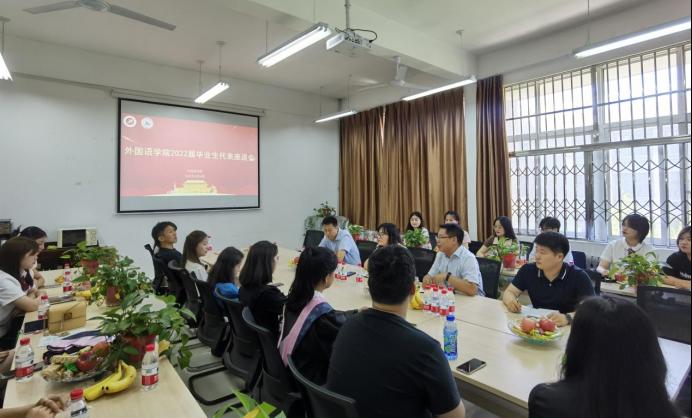 6月24日下午,外国语学院在鄠邑校区崇文楼314会议室召开2022届毕业生代表座谈会。学院党委书记田虹霞、副书记王业青、副院长陈武、学生工作办公室主任周宇、2018级辅导员陈浩以及2022届毕业生代表共计30余人参加座谈会。会议由院党委副书记王业青主持。