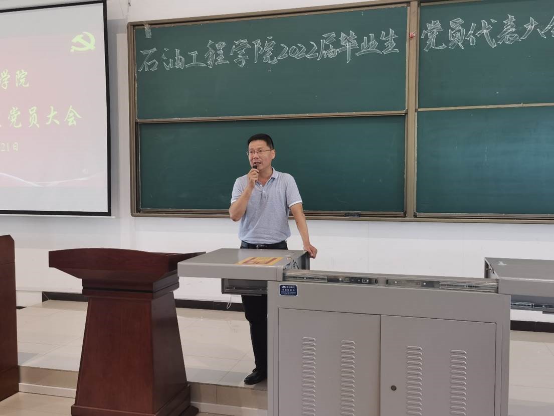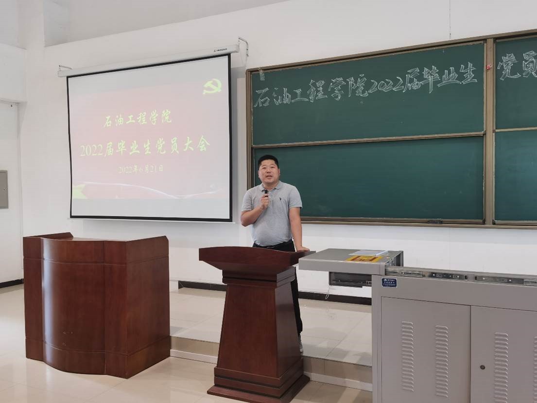 接着,张建高老师表达了对毕业生党员的殷切期望。他谈到,我院始终坚持传承并发扬先辈石油人苦干实干,三老四严的精神风貌,在教书育人方面始终贯彻石油精神、铁人精神和延安精神的核心要求。从学院毕业并走上岗位的学生,无一不是拥有四实一新品质的优秀青年,他们受到用人单位一致好评,为学校打出响亮的金字招牌,希望各位毕业生党员能够继续扛起旗帜,奋斗在各自岗位一线,发光发热。