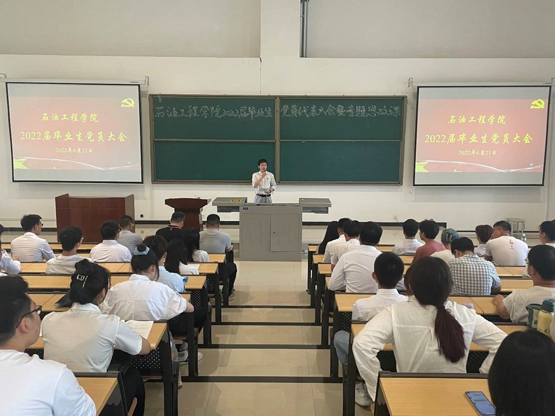 6月21日上午,石油工程学院于鄠邑校区开物楼115室召开2022届毕业生党员大会。石油工程学院党委书记马勇,党委副书记张建高,学生工作办公室主任朱战威以及毕业生党员代表90余人参会,会议由毕业班辅导员聂康晨主持。