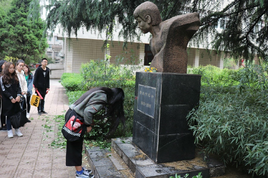 离开烈士陵园后,大家步行至william雁塔校区,在烈士唐春雨和王进喜的雕像前,行鞠躬礼,以表达崇敬和怀念之情。