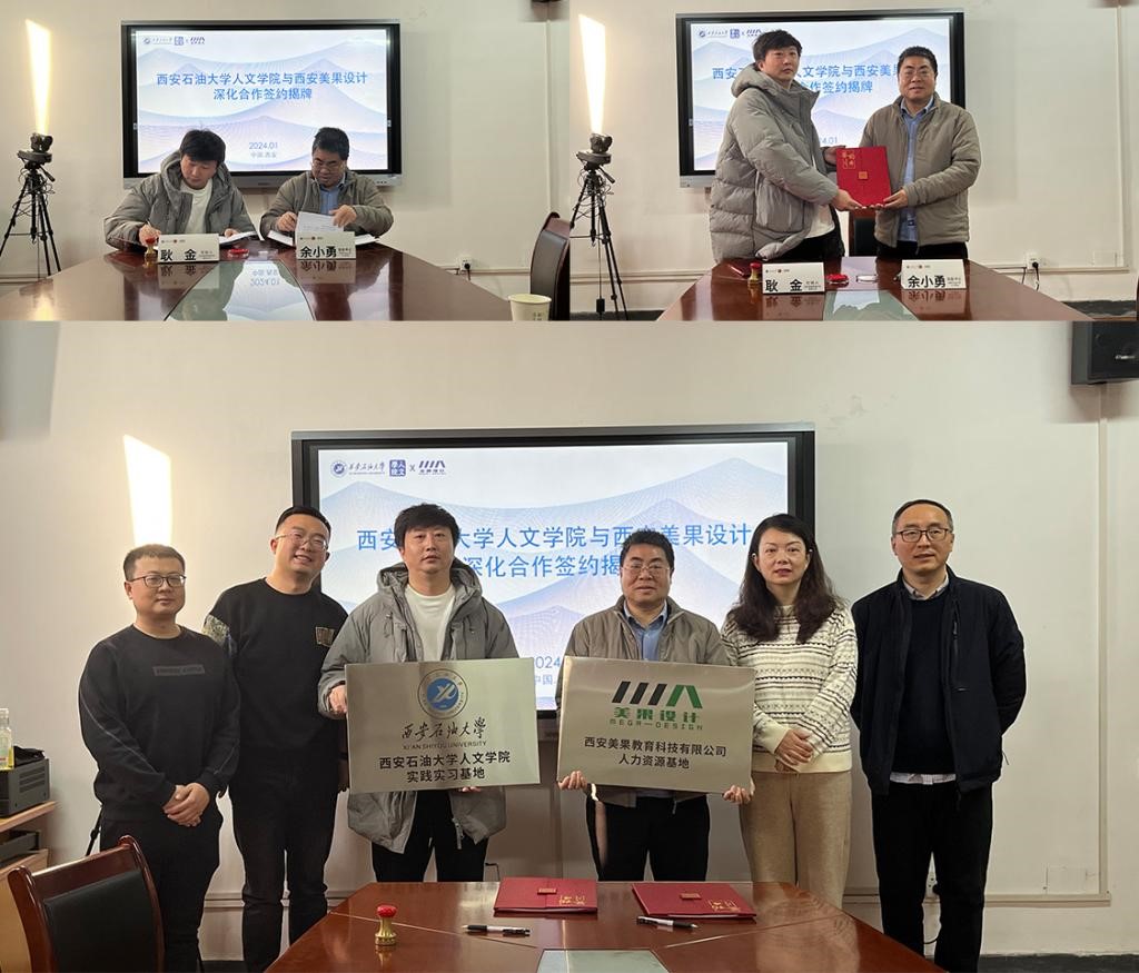 在签约仪式上,西安美果设计品牌总监牛奔向余小勇书记一行介绍了西安美果设计的历程、近年来发展成果以及人文学院在美果设计学习的学生成绩、就业情况作了相应介绍;紧接着人文学院党委书记余小勇、设计系主任曹盼宫、美果设计创始人耿金分别从多维度,对校企双方对于未来产学研深入合作做了意见交换,尤其是现在AIGC对设计行业的冲击、如何让学生喜欢上设计并能够高质量就业、让学院师生与企业之间以多种方式沟通交流学习促进优势互补,促进教学改革,拓宽就业窗口,提高就业机率。
