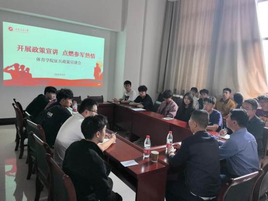 为积极响应国家号召,增强学生国防意识,激发学生爱国热情,4月16日下午,体育学院在鄠邑校区新操场208会议室举办以“开展政策宣讲,点燃参军热情”为主题的征兵政策宣讲会。会议邀请学校保卫部(处)、武装部副部(处)长袁坤主讲,学院各年级有应征入伍意愿的学生近20人参加,会议由学院党总支书记苟毅飞主持。