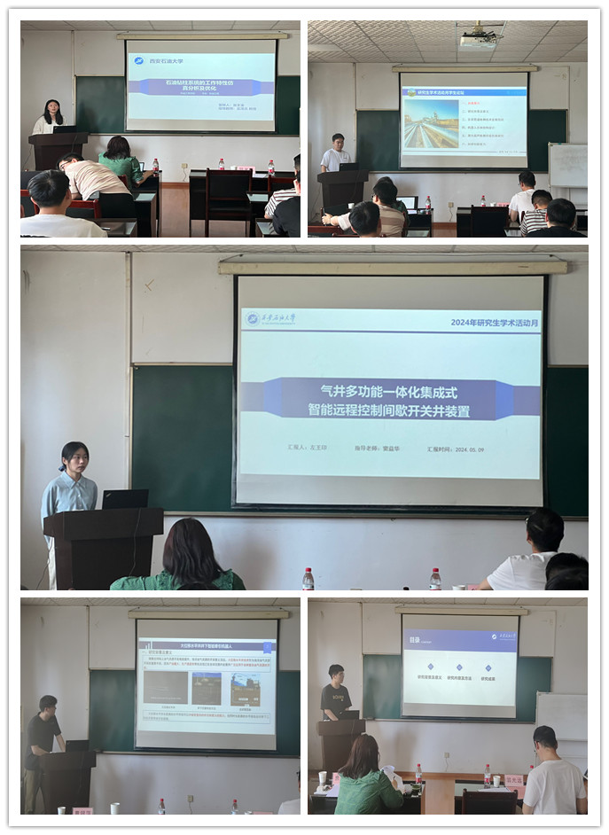 2021级研究生张文溪和裴龙瑶、2022级研究生尚祖跃、左王印和王亨通,分别作了题为《石油钻柱系统的工作特性仿真分析及优化》《超音速分离管内自发凝结及气液分离过程研究》《管道检测机器人关键技术》《气井多功能一体化集成式智能远程控制间歇开关井装置》《大位移水平井井下智能牵引机器人》的报告。