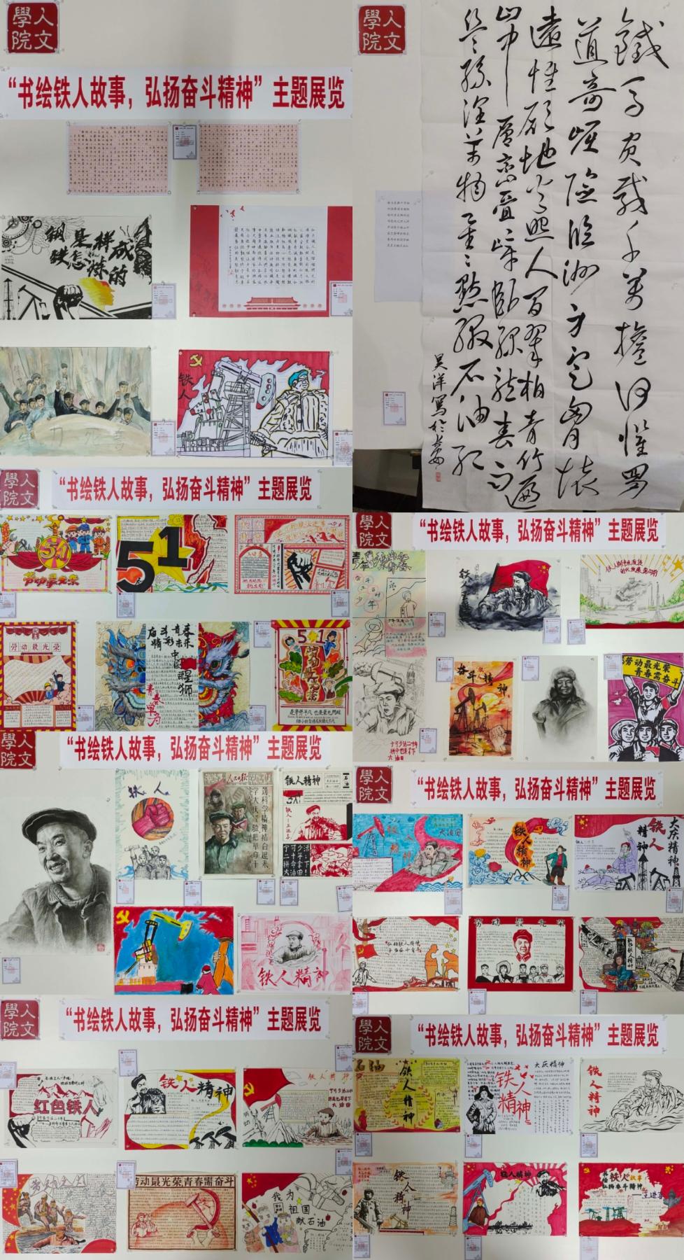 为进一步加强铁人精神育人,深化美育建设,引导学生传承红色基因,凝聚奋进力量。5月29日至5月31日,人文学院“忠实”学生党建工作室在鄠邑校区崇文楼南门门厅开展“书绘铁人故事,弘扬奋斗精神”主题展览活动。